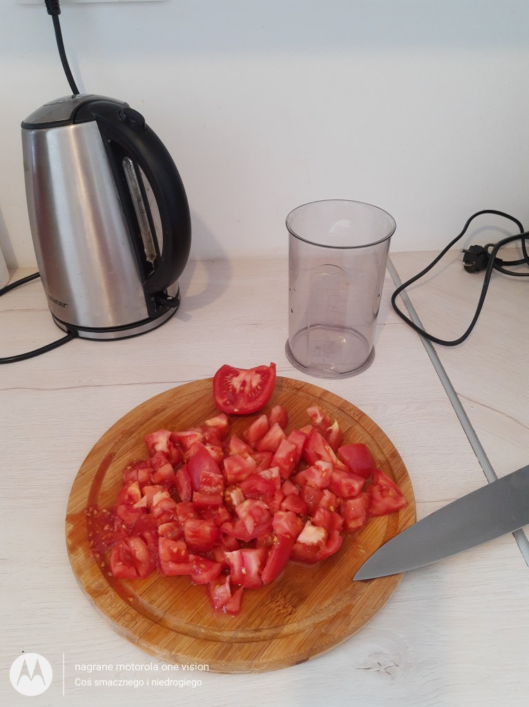 W tym czasie myję pomidory, wstępnie oczyszczam i kroję w większe kawałki oraz blenduję na mniej więcej jednolitą masę.