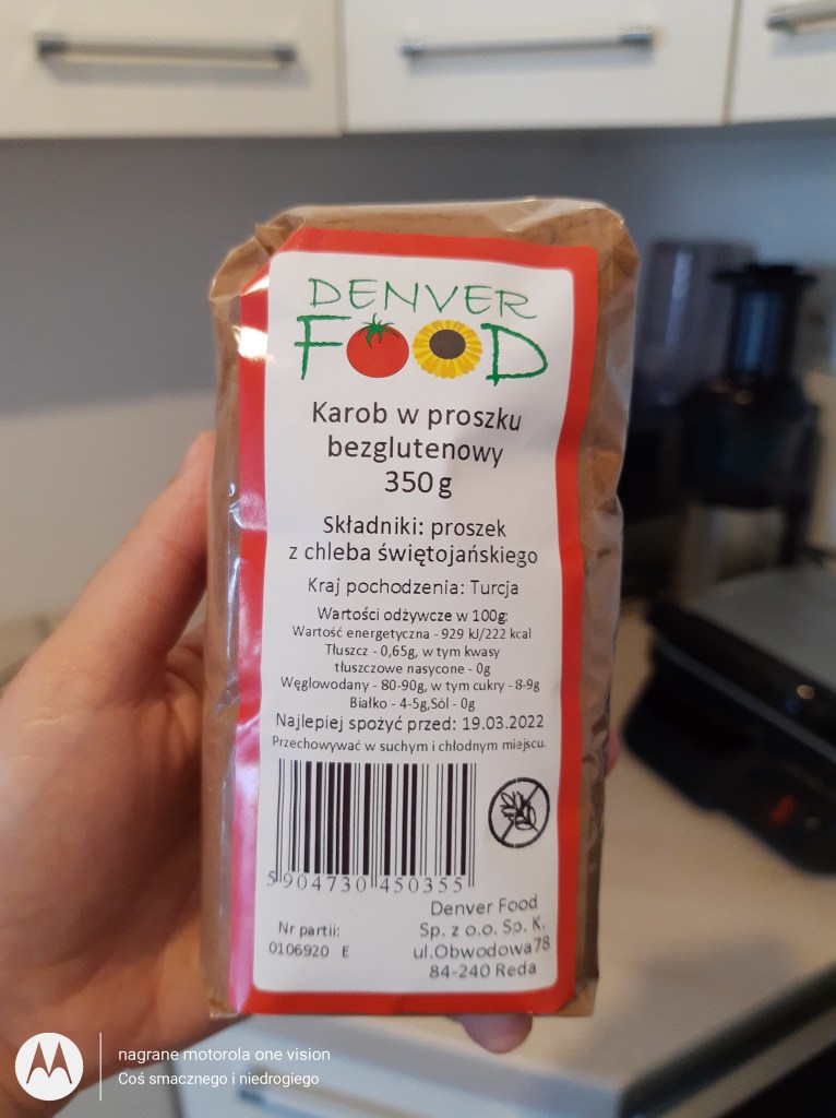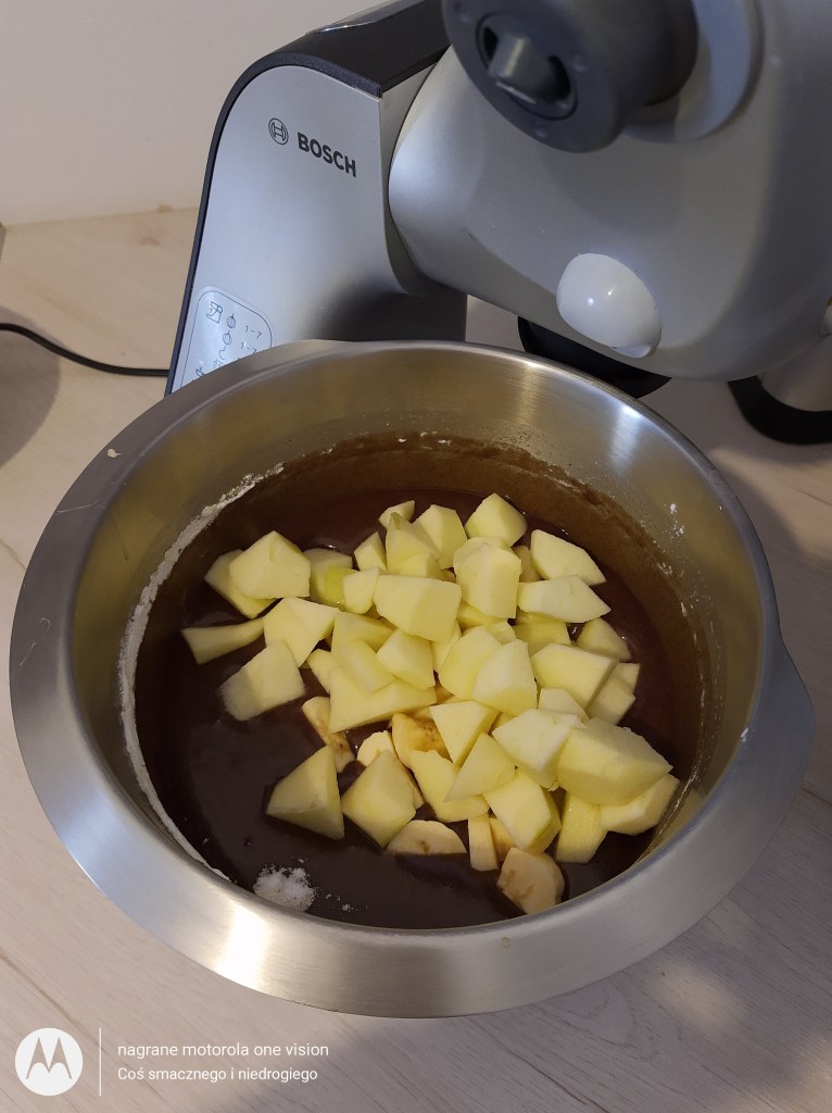 Odmierzam poszczególne mąki i łączę je z: karobem oraz proszkiem do pieczenia i sodą oczyszczoną, które dodaję powoli do ciasta ciągle mieszając na wolnych obrotach.