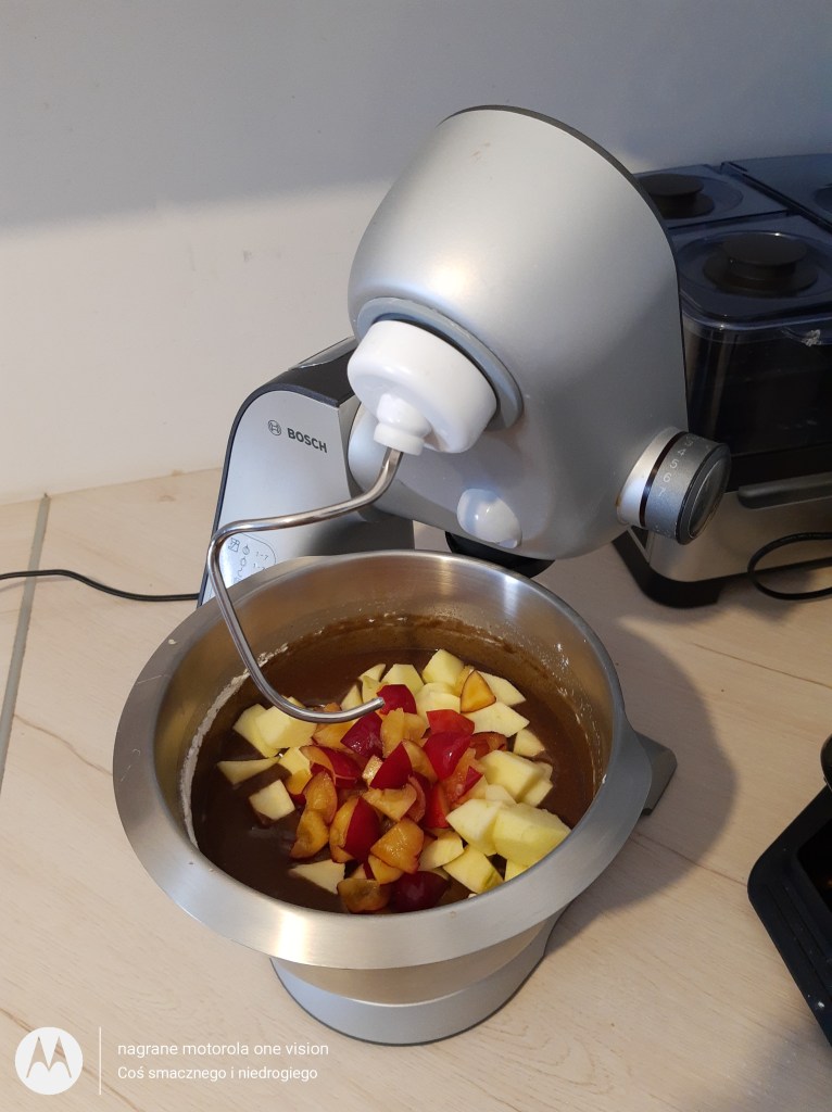Owoce łączę z ciastem i przelewam do formy silikonowej oraz wstawiam do nagrzanego piekarnika na ok 180 stopni w termoobiegu do momentu ,,suchego,, patyczka (u mnie wystarczyło 45 minut ale ten czas może ulec zmianie w zależności od tego jakiej użyjemy formy).