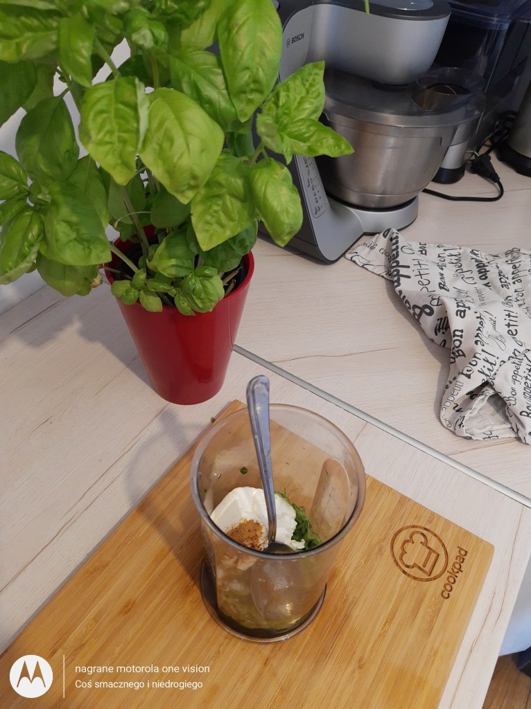 Listki bazylii zrywam, myję i przekładam do szpinaku wraz z fetą, sokiem z cytryny, olejem i przyprawami.