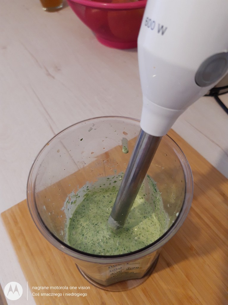 Zamrożony szpinak wyjmuję wcześniej i kiedy będzie gotowy odmierzam oraz przekładam do wąskiego pojemnika blendera.