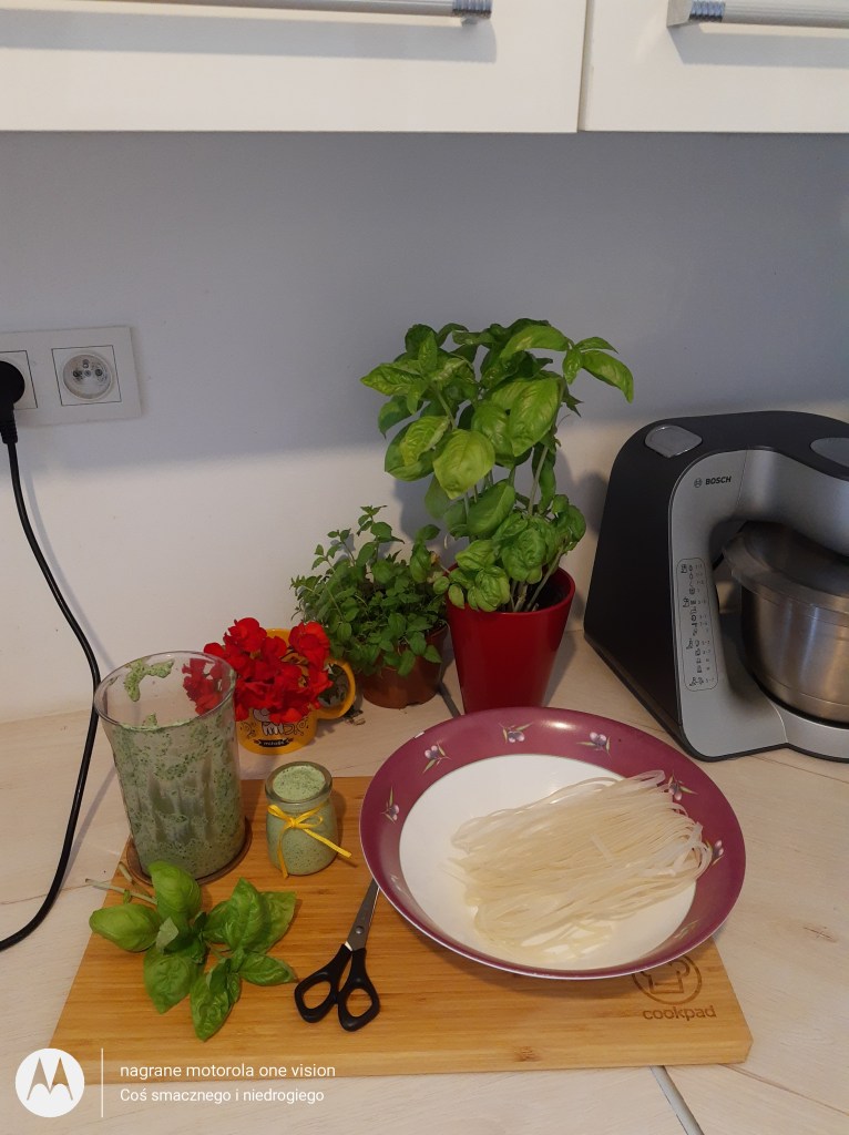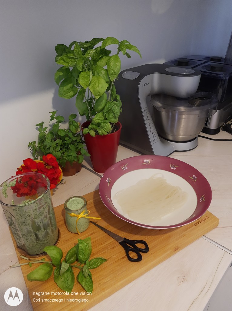 Moja wariacja z pesto pasuje do makaronu ryżowego, który przekładam do miski i zalewam wrzątkiem oraz pod przykryciem pozostawiam do nasiąknięcia.