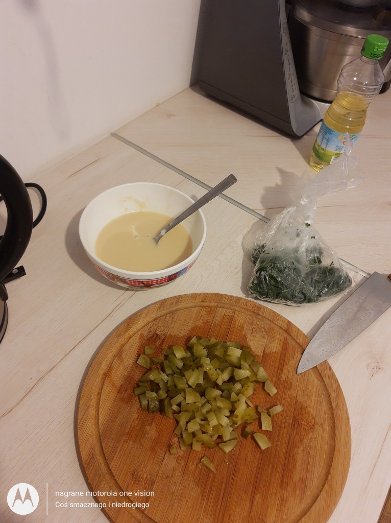 Ogórki wyjmuję z zalewy i kroję drobno, a następnie wraz z mrożoną zieleniną przekładam do miseczki.