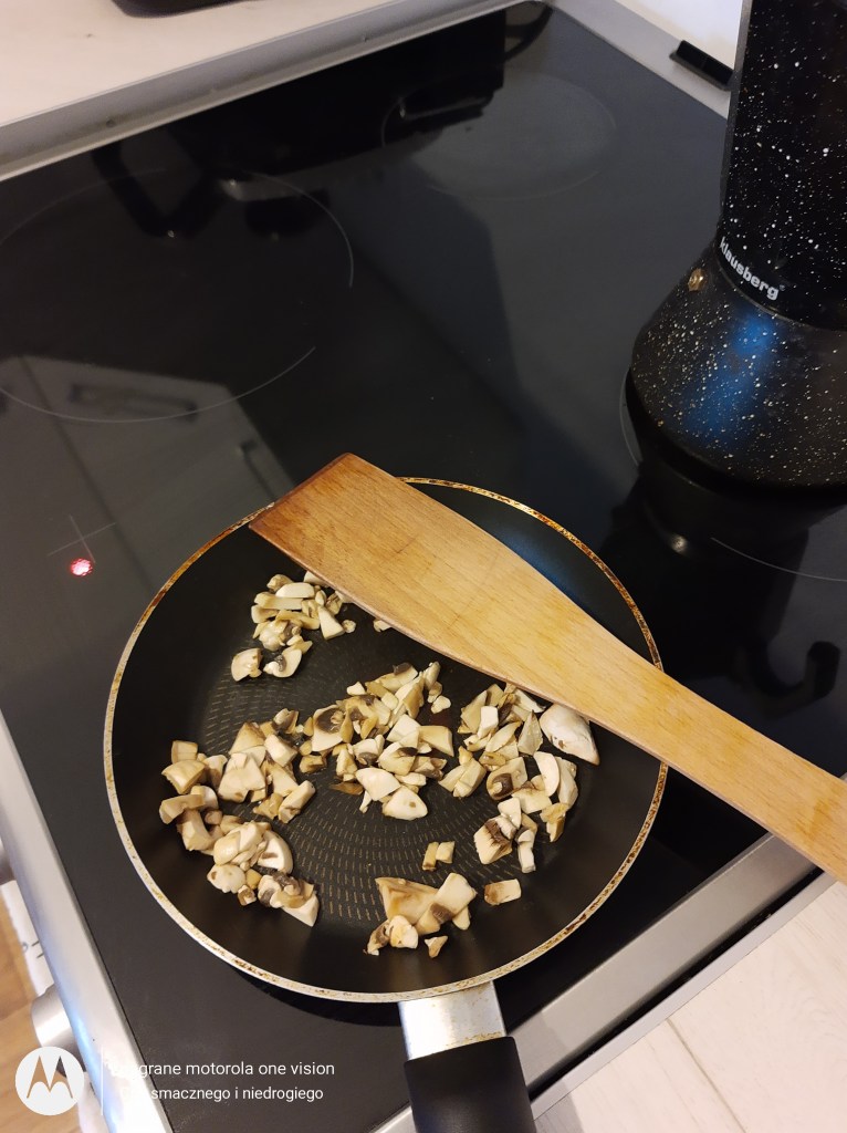 Na rozgrzanej patelni wlewam wodę, którą zagotowuję i łączę z grzybami do momentu ,,poduszenia,,.