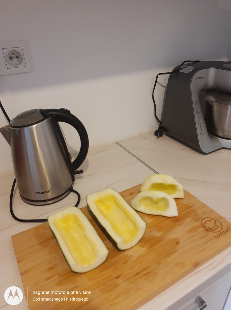 Cukinię myję oraz wstępnie oczyszczam, podobnie postępuję z patisonem tylko z tą różnicą iż jego obiaram.