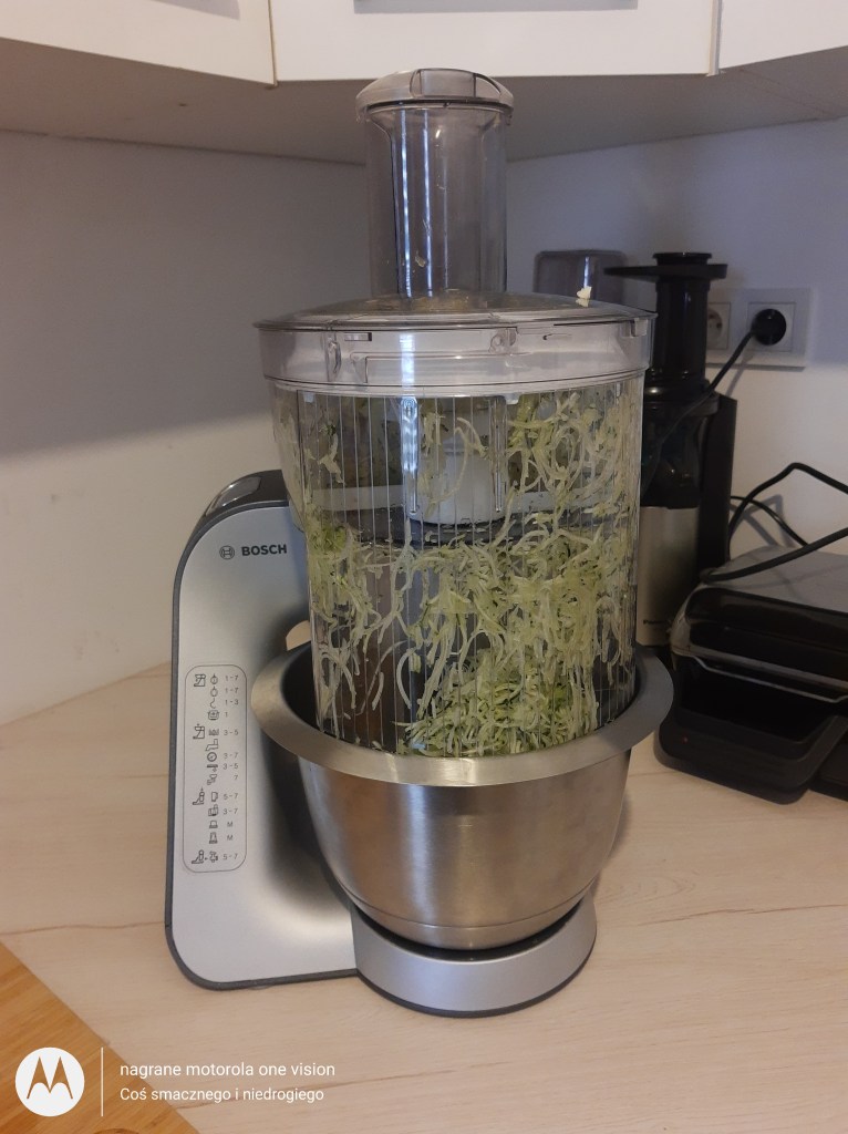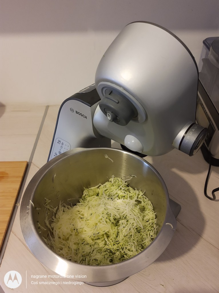 Za pomocą robota kuchennego warzywa ścieram na dużych oczkach i przekładam do dużej miski.