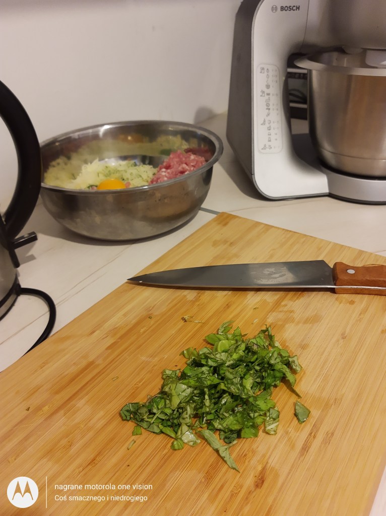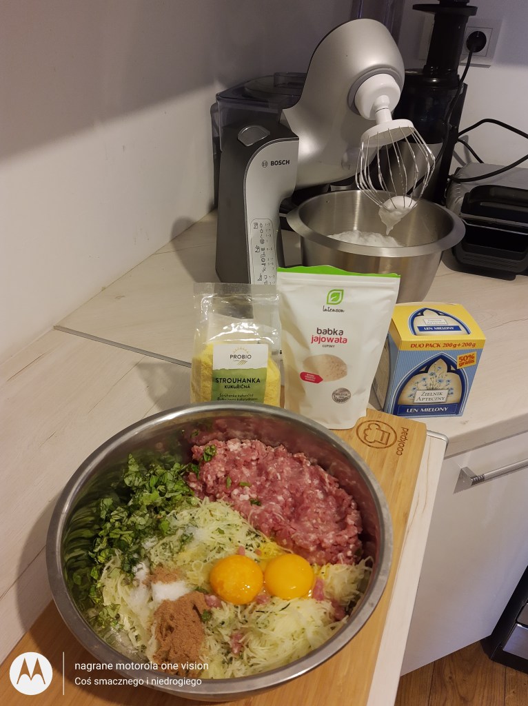 Do pozostałe składniki łączę z: żółtkami, wszystkimi suchymi elementami, bazylią i wyrabiam na jednolitą masę.