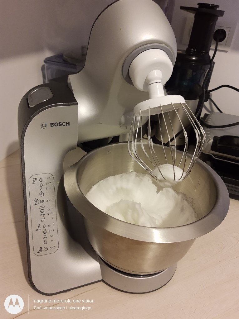 Jajka rozdzielam, a z białek wraz ze szczyptą soli ubijam sztywną pianę.