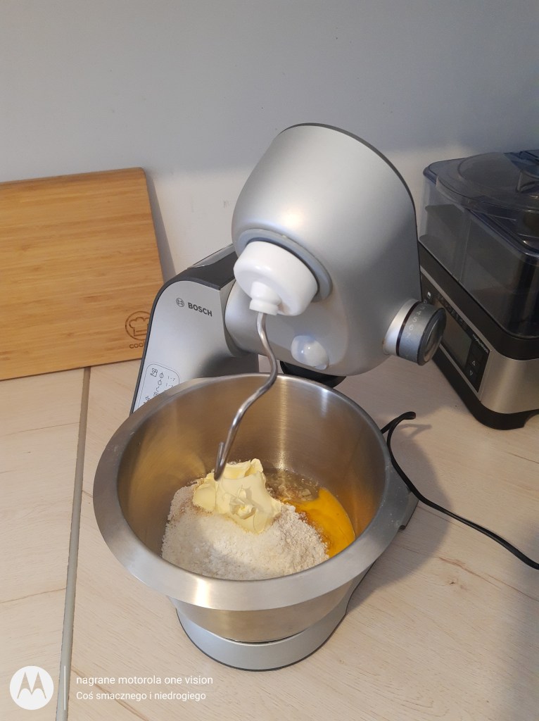 Do misy robota kuchennego wsypuję wszystkie odmierzone suche składniki oraz wbijam jajko i dodaję pokrojone w dużą kostkę masło.