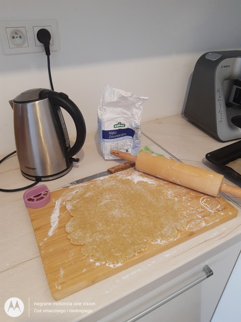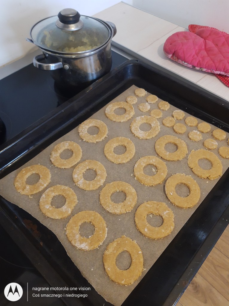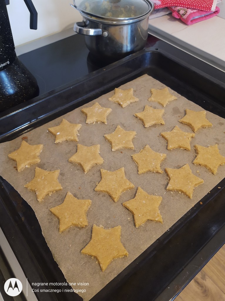 Na desce posypanej mąką ziemniaczaną rozwałkowuję ciasto, a foremkami wykrawam ciasteczka, które przekładam na blaszkę wyłożoną papierem do pieczenia i wkładam do nagrzanego piekarnika.
