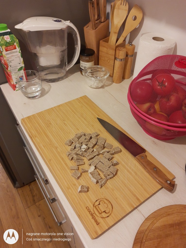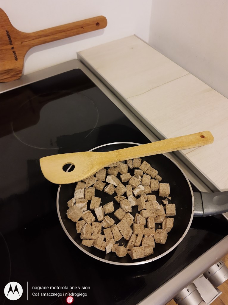 Bułkę kroję w grubszą kostkę, którą podpiekam na suchej rozgrzanej patelni.