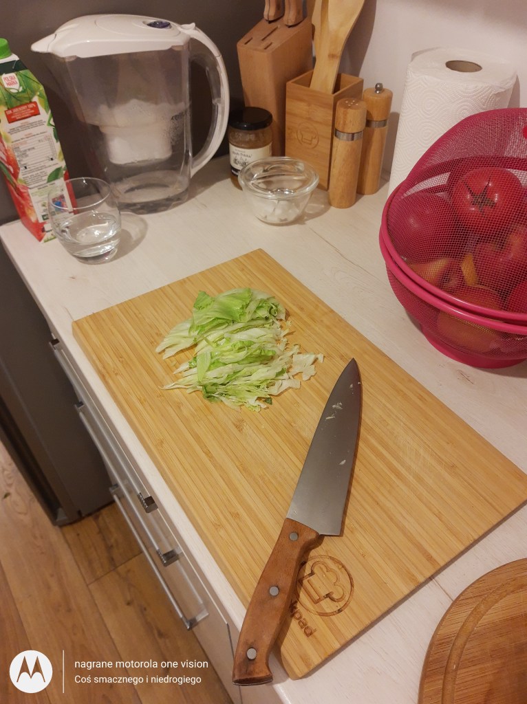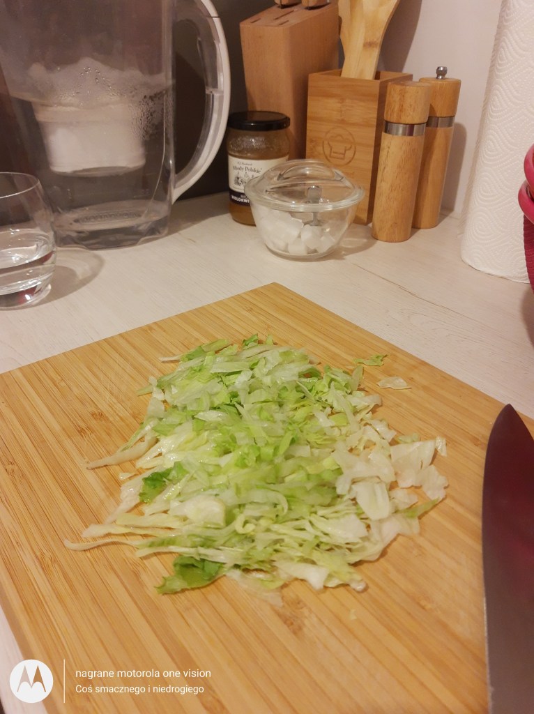 Sałatę lodową myję oraz drobno kroję i przekładam na wcześniej przygotowany talerz.