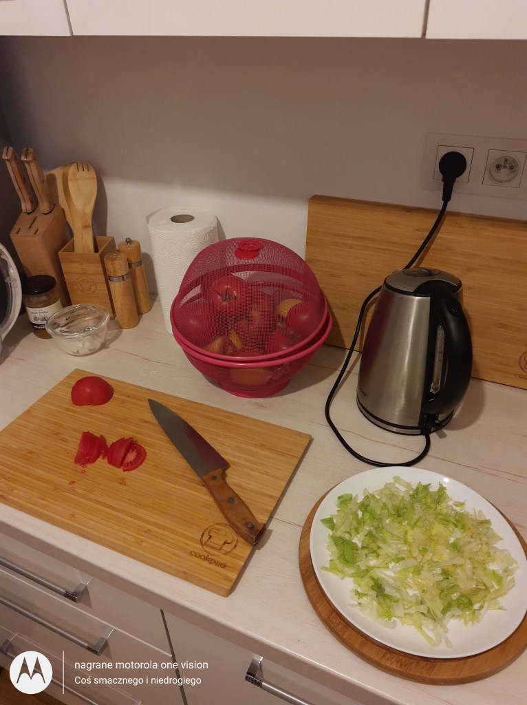 Pomidor również myję oraz także kroję lecz w pół-plasterki, a następnie dodaję do pozostałych składników.