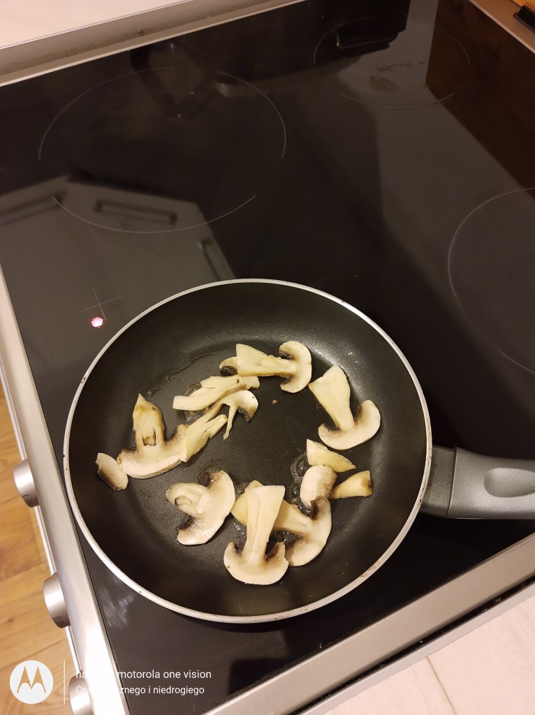 Pieczarkę wstępnie oczyszczam i kroję w plasterki.