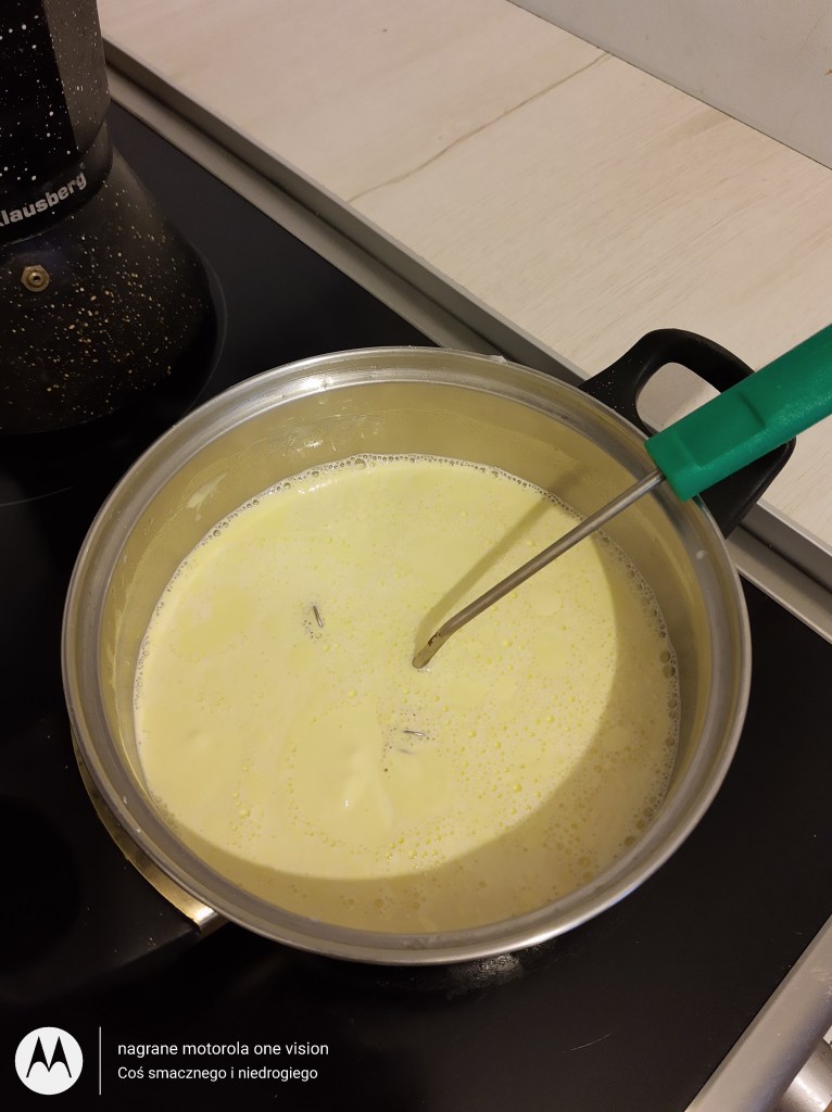 Do garnka wlewam: wodę, dodaję mleko, cukier puder oraz margarynę (masło) i kiedy dojdzie do zagotowania odstawiam do lekkiego przestygnięcia.