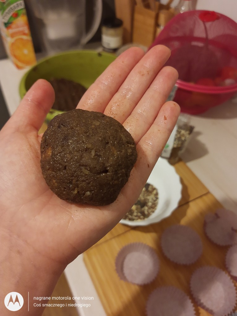 Rękoma zwilżonymi w wodzie formułuję większe kuleczki, które obtaczam w bakaliach oraz przekładam do papilotek.