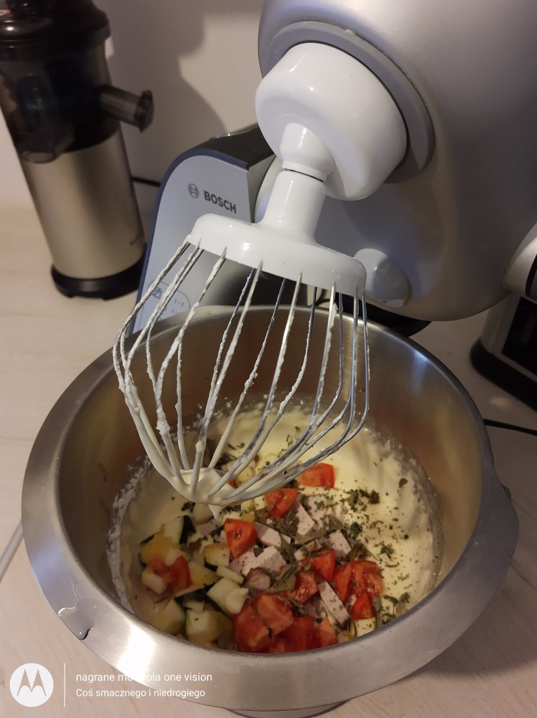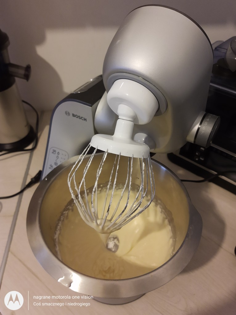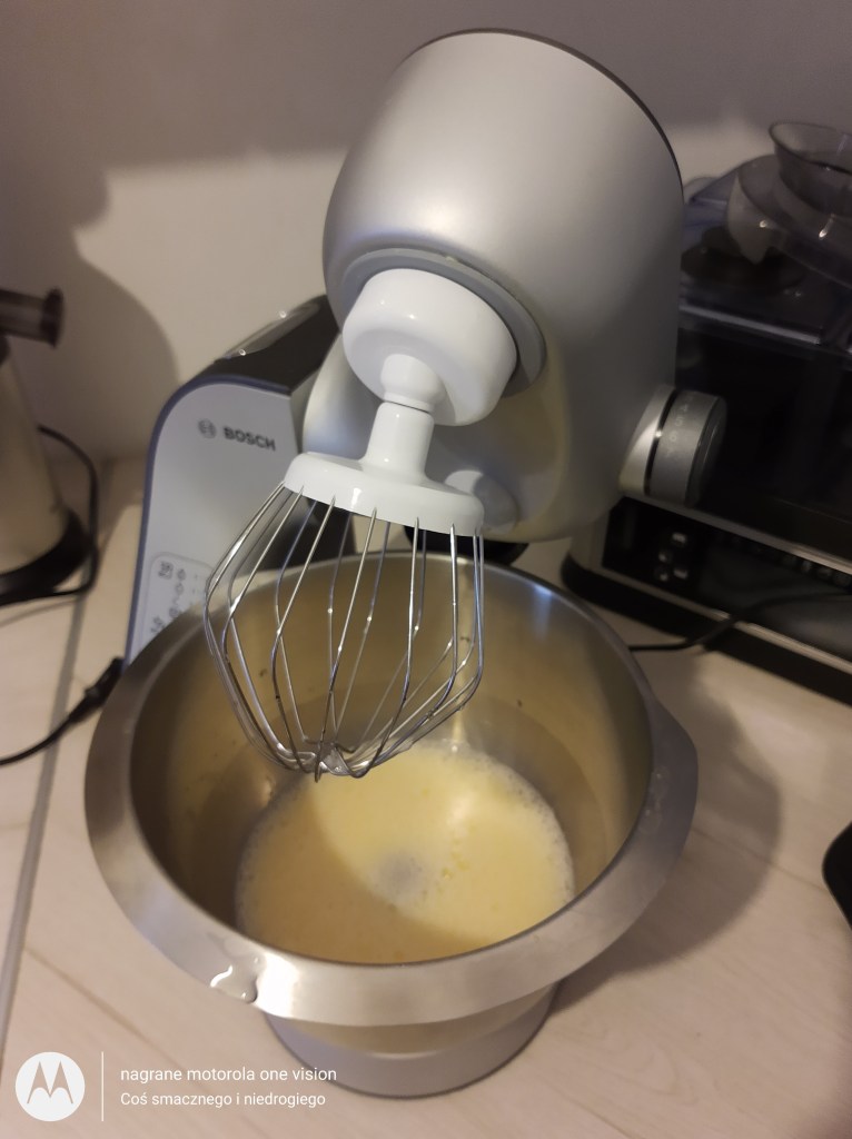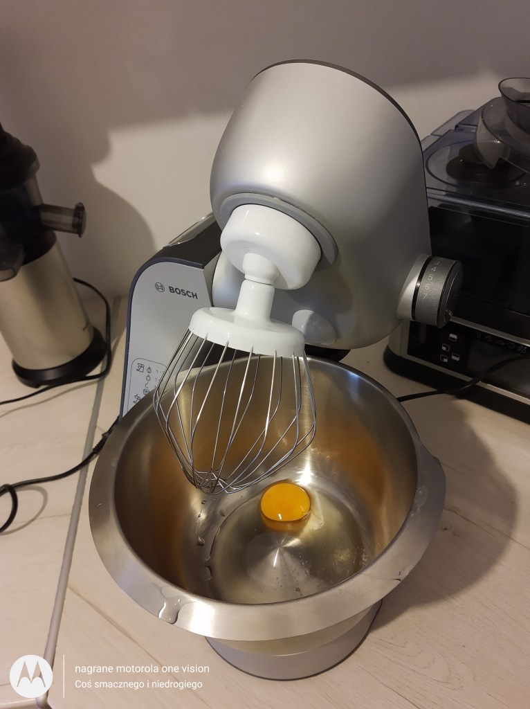 Do misy robota kuchennego wbijam jajko i wraz ze szczyptą soli-ubijam, a następnie wlewam wszystkie pozostałe mokre składniki.
