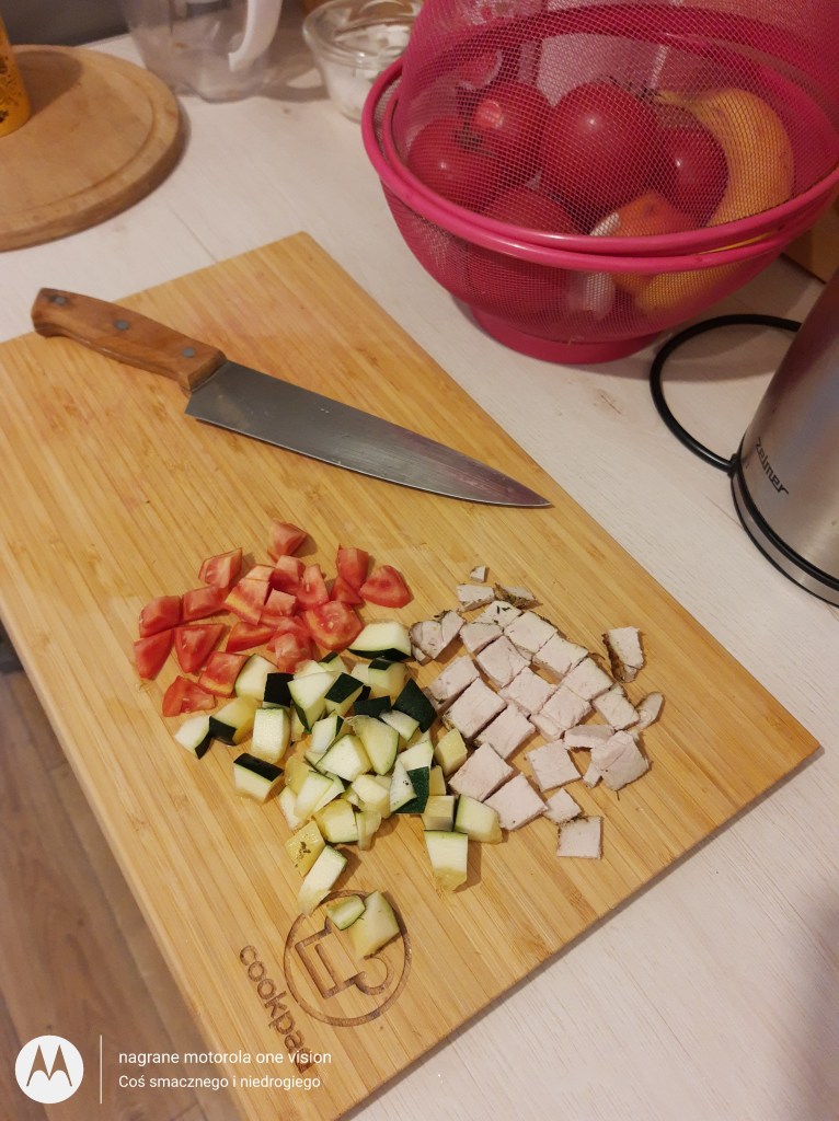 Pomidora i cukinię myję, wstępnie oczyszczam i kroję, a wędlinę grubo szatkuję.