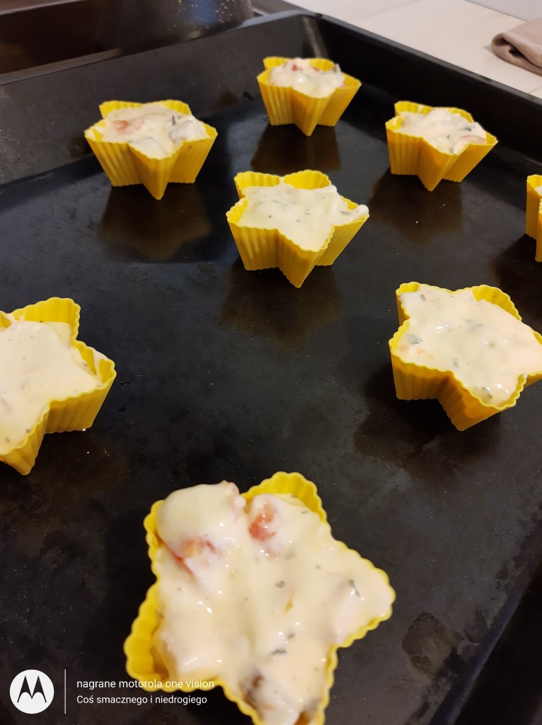 Ciasto przekładam do silikonowych foremek i wstawiam do nagrzanego piekarnika na ok 180 stopni na funkcji termoobieg i piekę 30 minut.