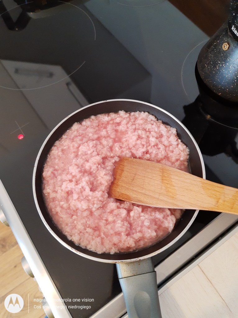 Na patelnię wlewam wodę oraz dodaję mięso mielone, które obgotowuję i kiedy będzie gotowe wlewam przekładam do garnka o grubym dnie.