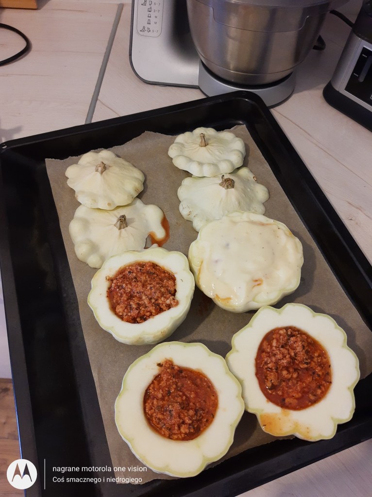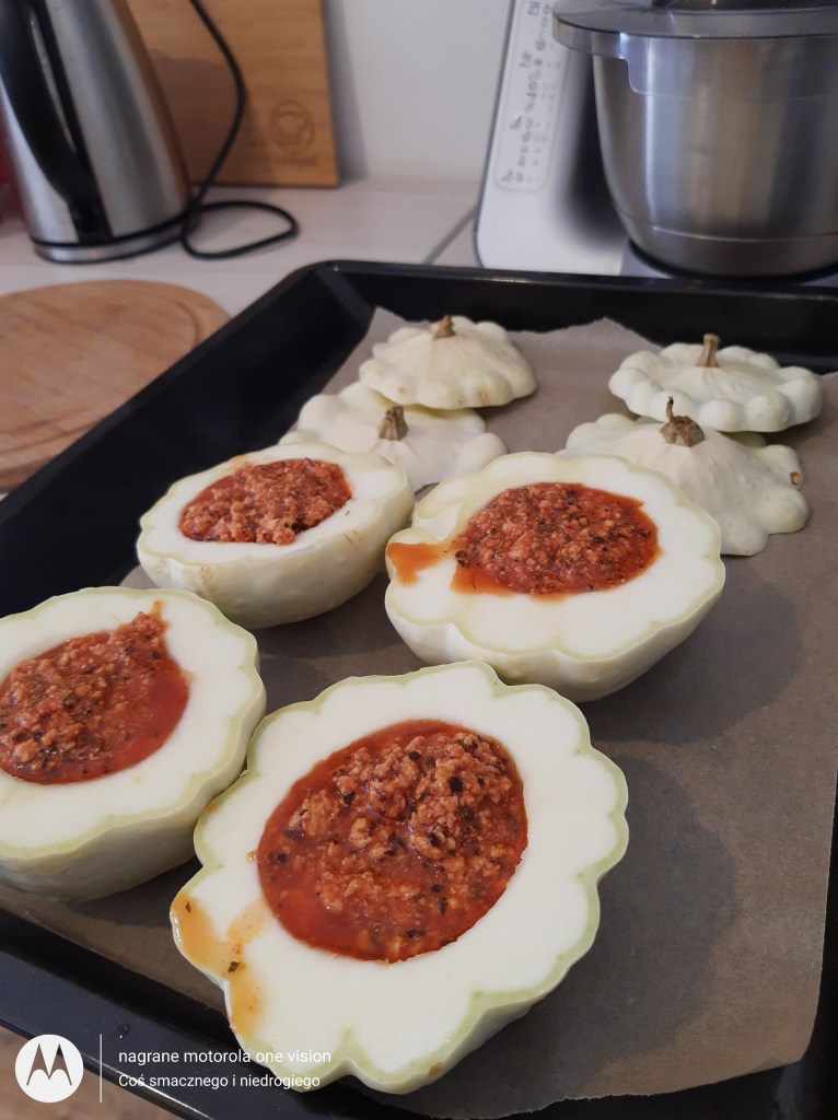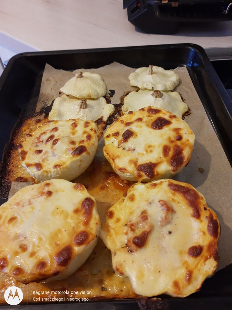 Beszamelem smaruję patisony,które wstawiam do nagrzanego piekarnika na około 180 stopni na funkcji termoobieg i piekę przez około 40-45 minut.