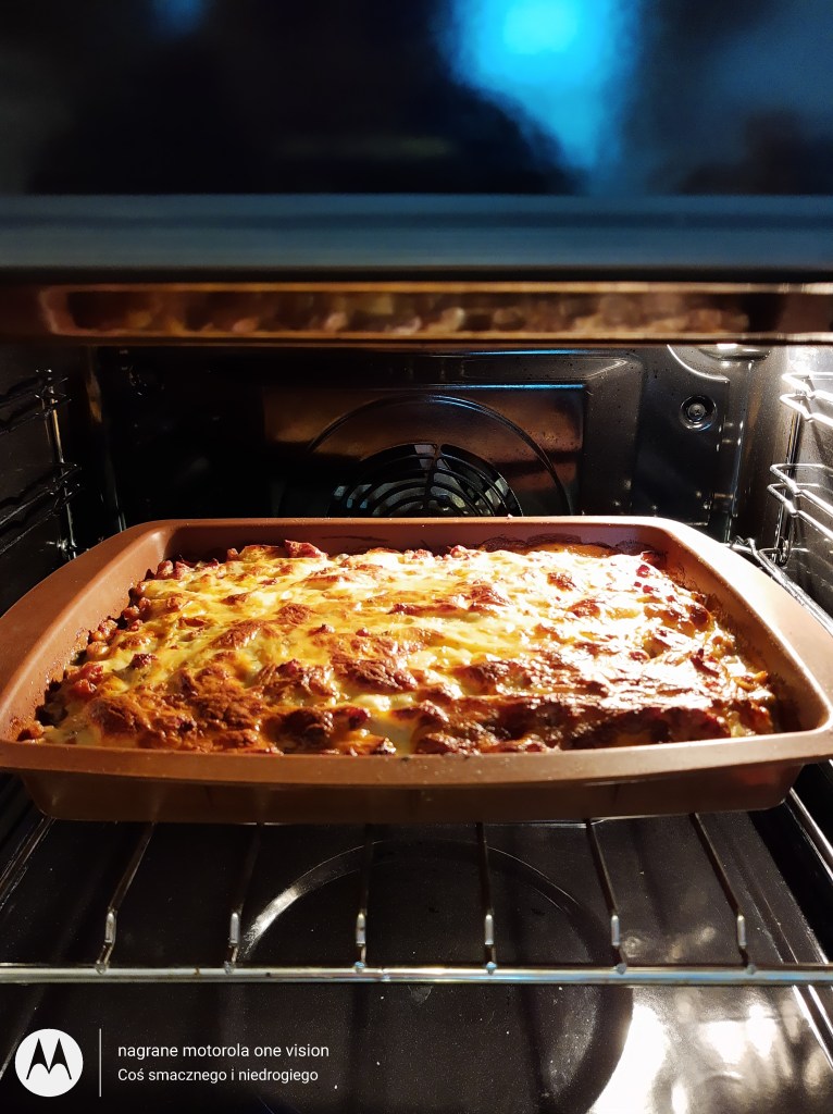 Składam zapiekankę czyli na warstwę warzywną kładę mięso,które przykrywam ziołowym beszamelem z fetą i piekę maksymalnie 40 minut w 180 stopniach na termoobiegu.
