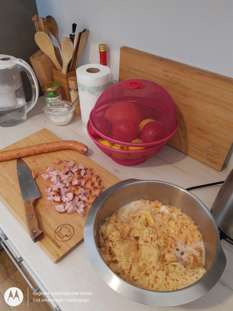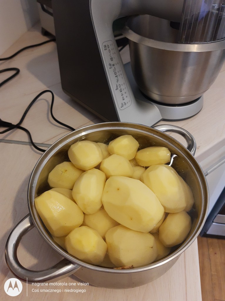 Ziemniaki obieram,myję oraz ścieram na najmniejszych oczkach lub w robocie kuchennym na specjalnej nakładce do pyz.