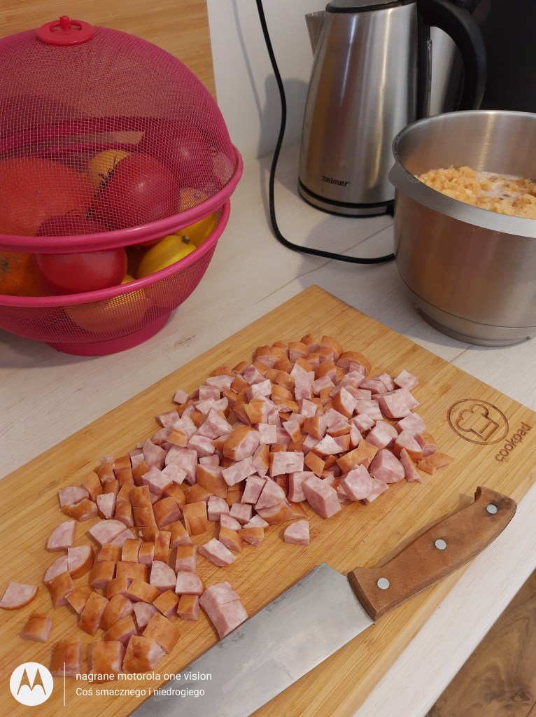 Kiełbasę kroję w grubszą kostkę.