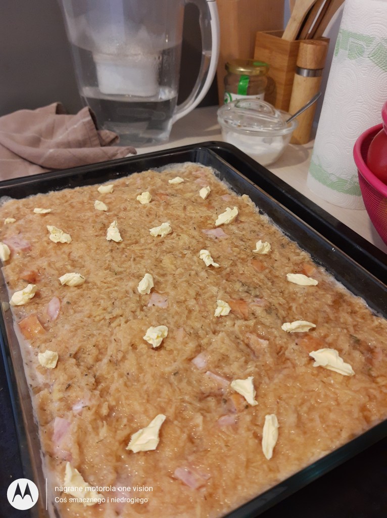 Zapiekankę wyrównuję i na wierzch kładę wiórki masła.