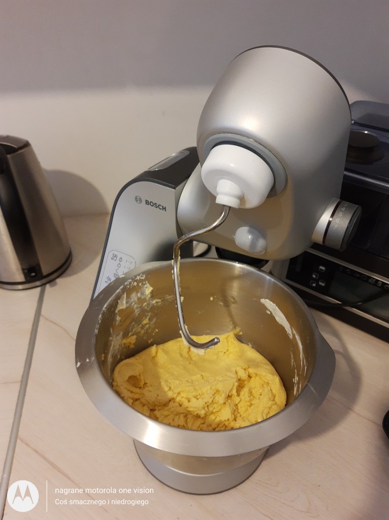 Do misy robota kuchennego wsypuję wszystkie suche składniki na ciasto, potem dodaję pokrojone masło, następnie wlewam jogurt naturalny oraz uruchamiam sprzęt.