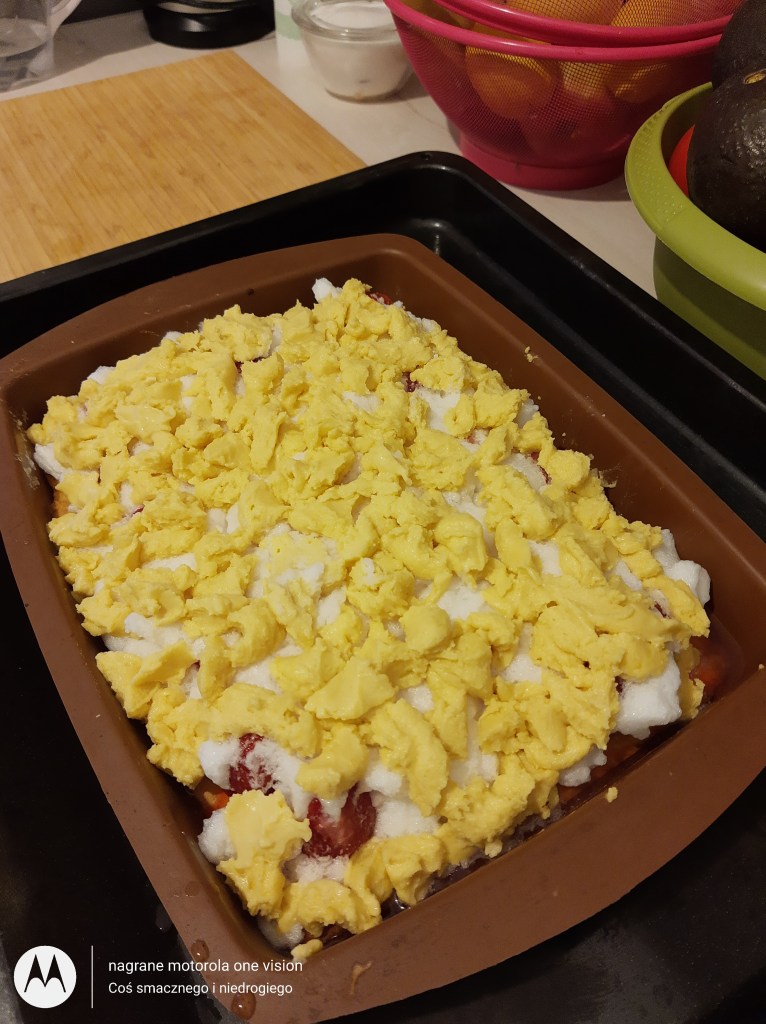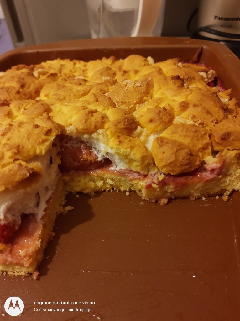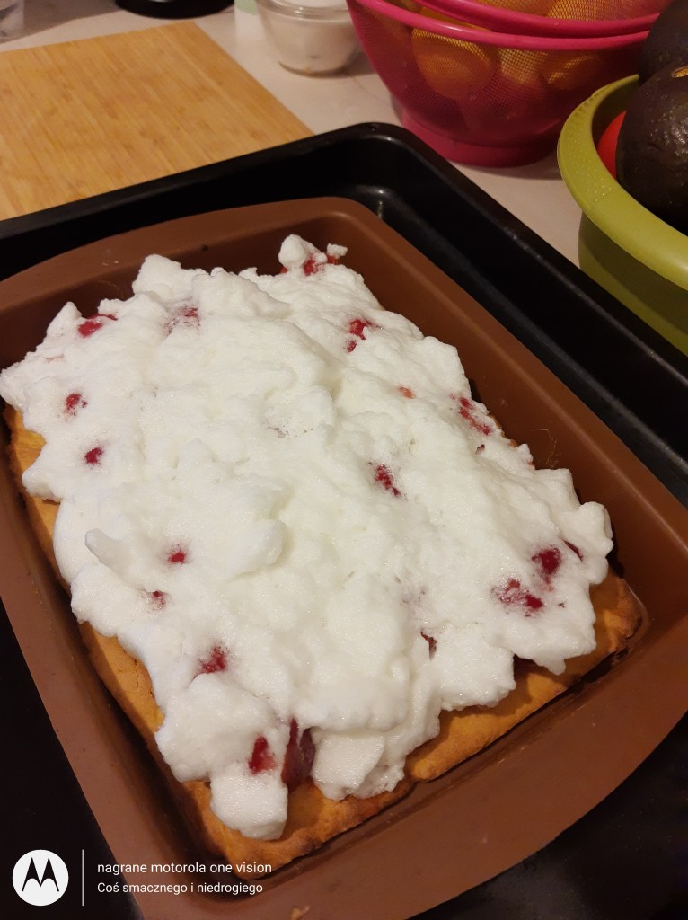 Na podpieczone ciasto układam warstwę truskawek, następnie pianę z białek i na górę kawałki z pozostałej części ciasta.