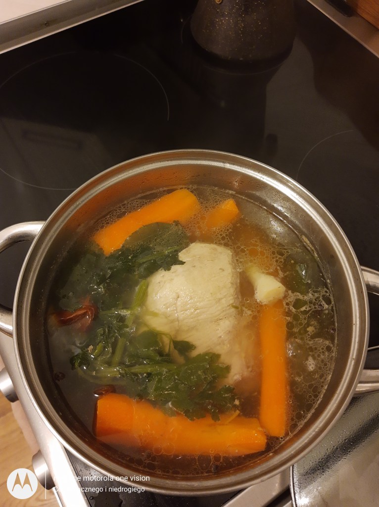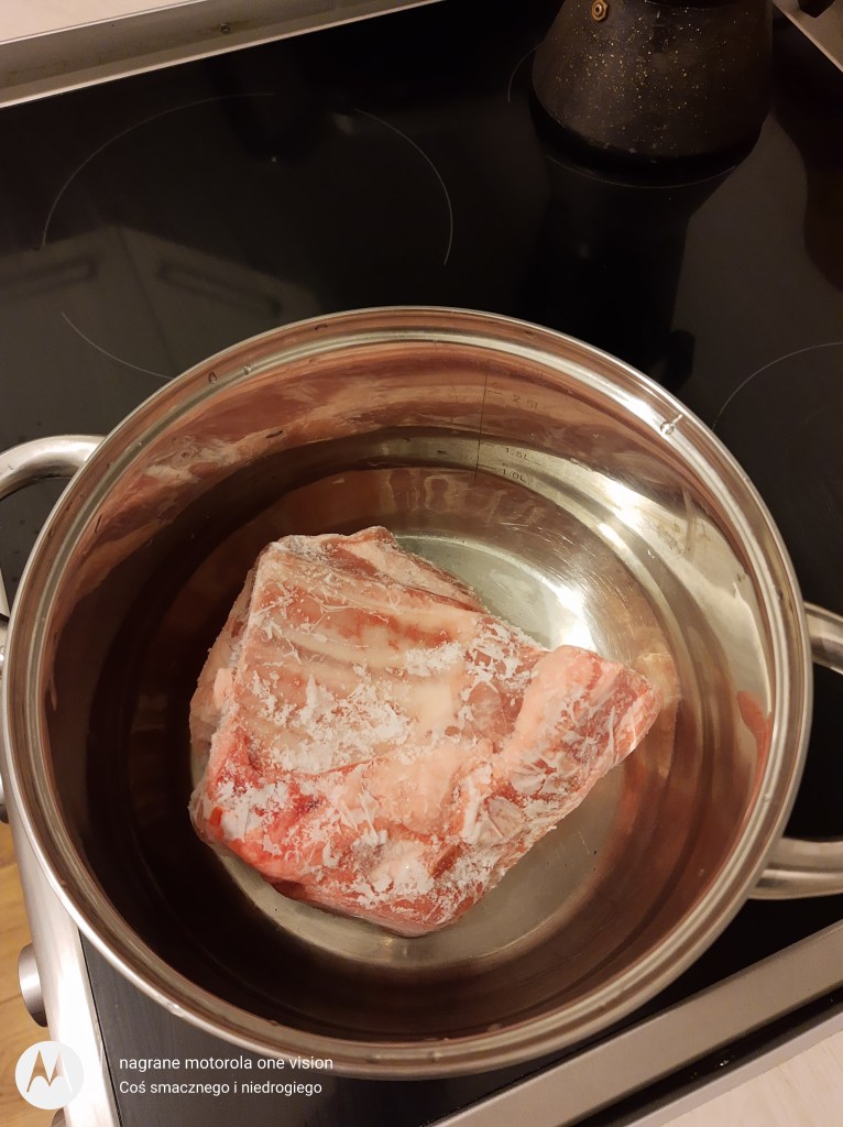Do większego garnka wkładam: żeberko i wstępnie oczyszczoną, umytą włoszczyznę wraz z zgrillowaną cebulą oraz imbir i pozostałe przyprawy (bez soli).
