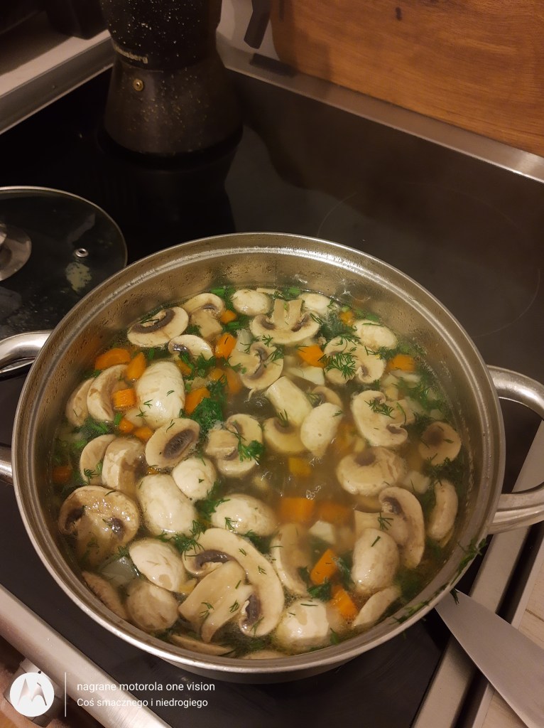 Pod koniec gotowania dokładam pokrojone w plasterki pieczarki oraz poszatkowaną w kosteczkę włoszczyznę.