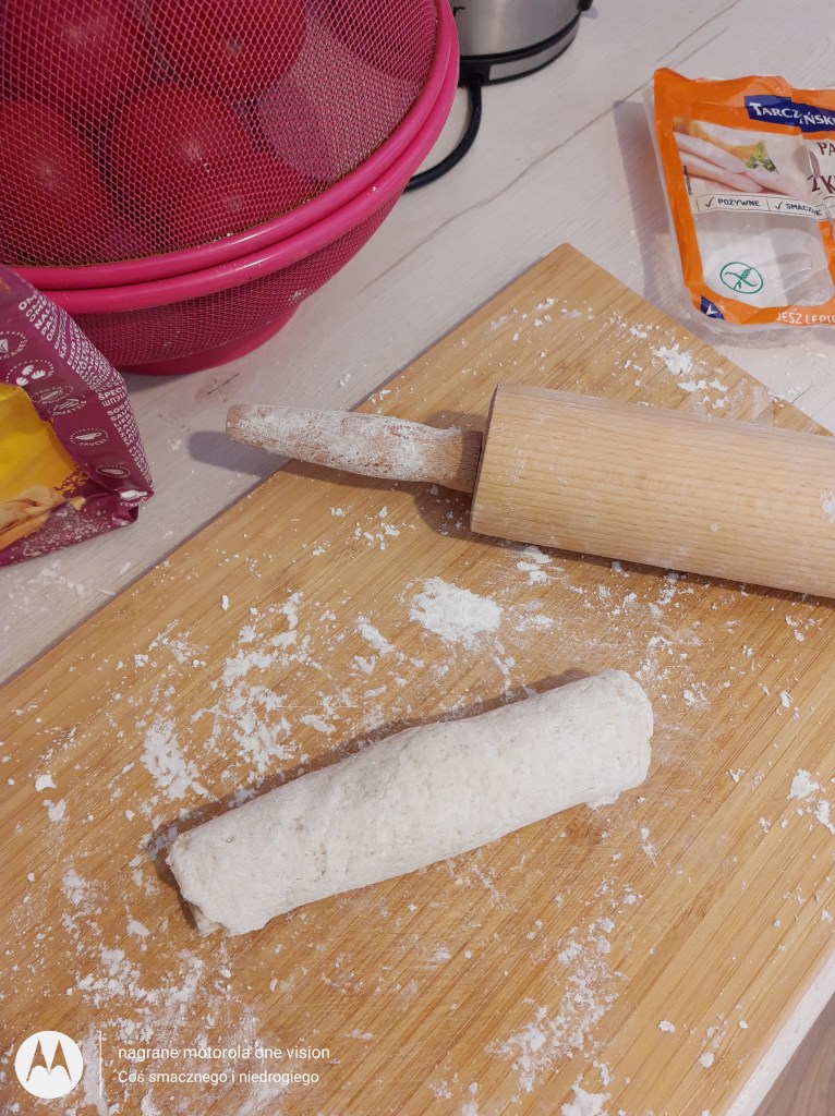 Otrzymane ciasto parokrotnie zagniatam ręcznie i po uzyskaniu odpowiedniej konsystencji urywam kawałki, które rozwałkowuję.