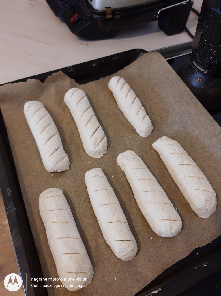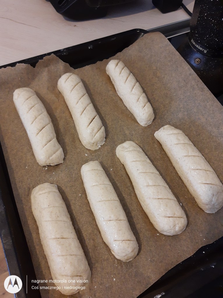 Dodatkowo nożem nacinam hot-dogi, które smaruję białkiem i wkładam do nagrzanego piekarnika do 50 stopni w termoobiegu przez około 20 minut aby podrosły.