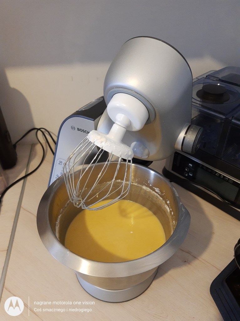 Do misy robota kuchennego wbijam jajka i na wysokich obrotach ubijam na puszystą pianę. Następnie dodaję po łyżce cukru wraz z opakowaniem cukru z prawdziwą wanilią.