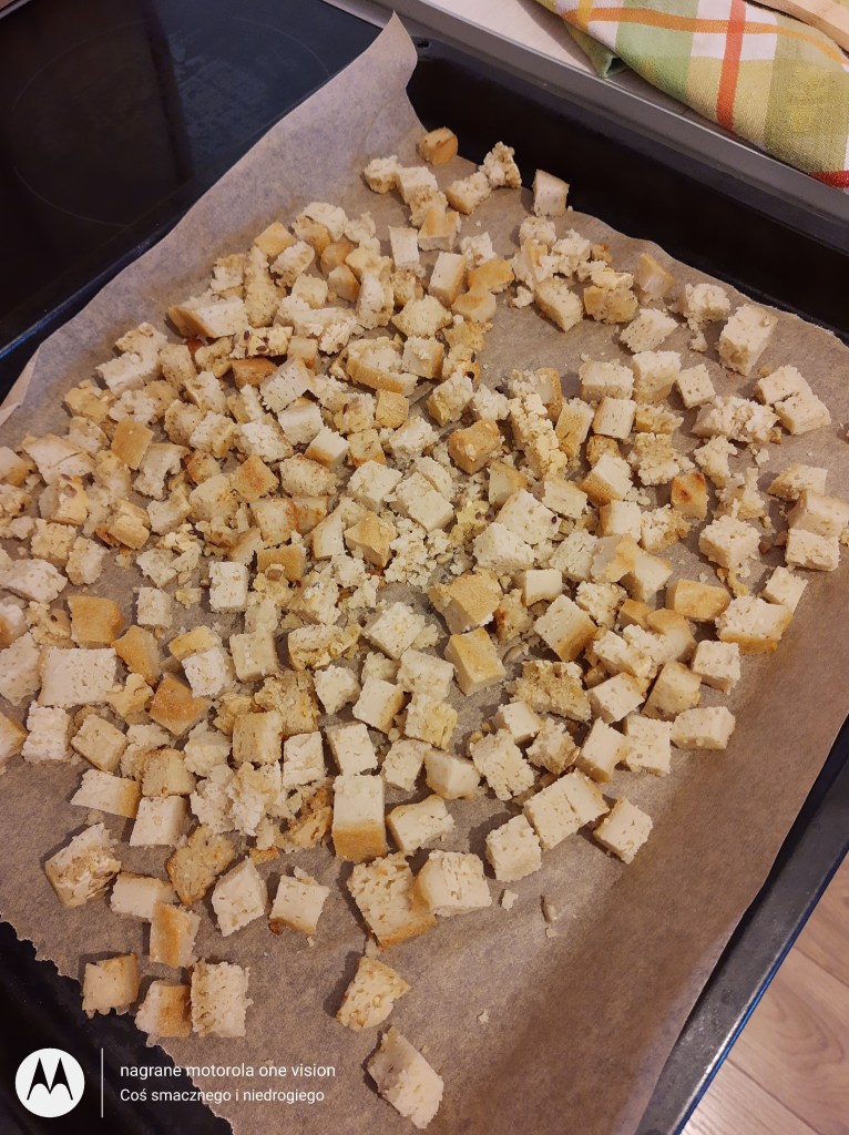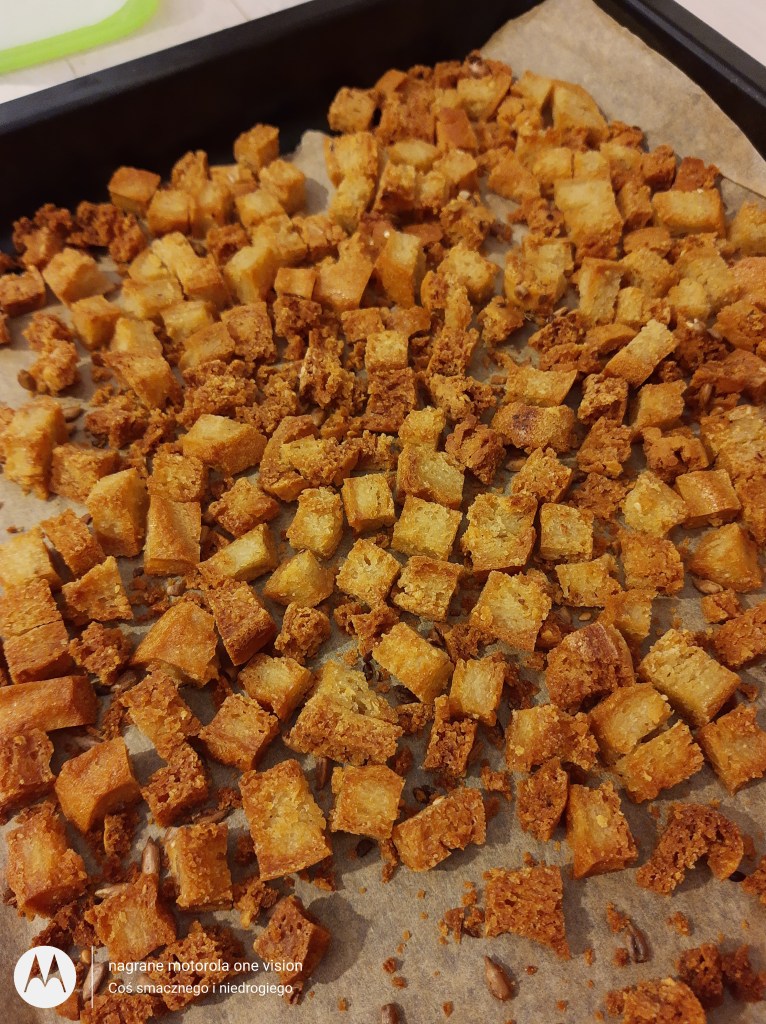 Krem podaję z przygotowanymi wcześniej grzankami bezglutenowymi i poszatkowaną natką pietruszki.