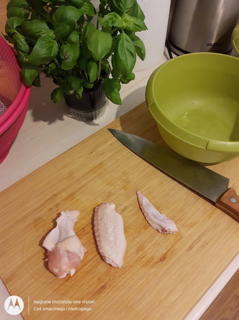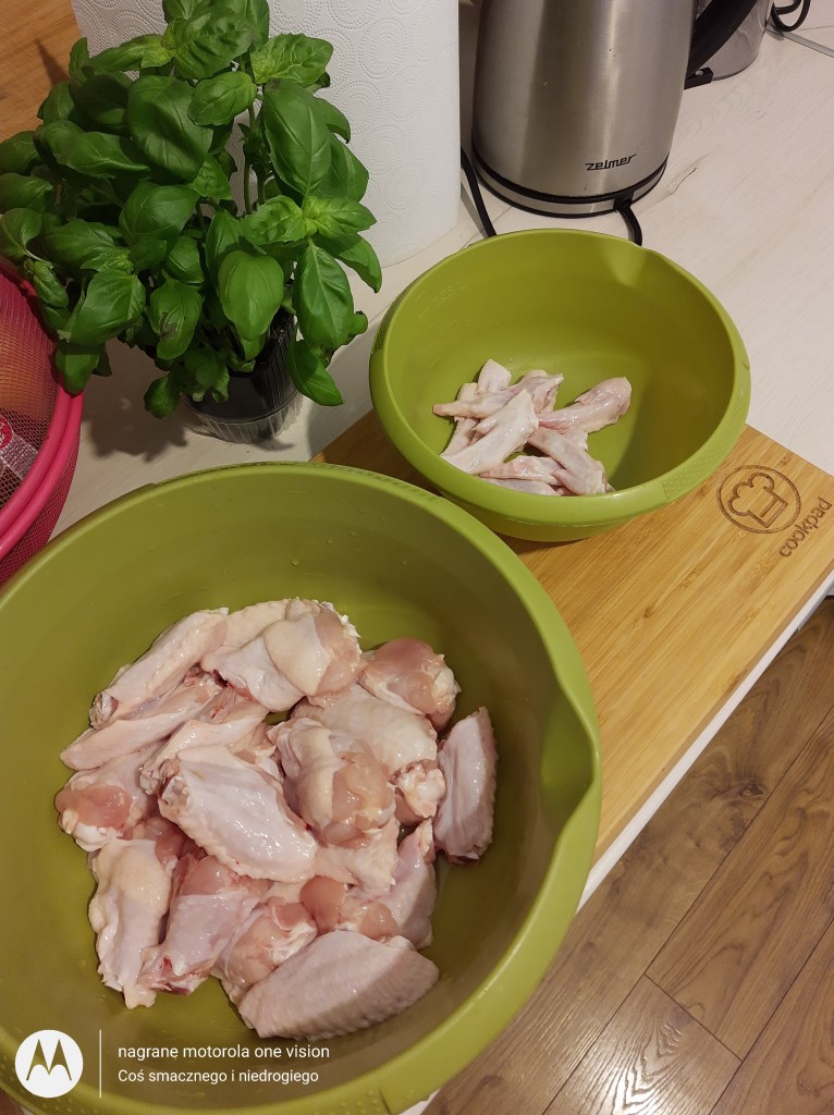 Skrzydełka przekładam do większej miski, a pozostałości (lotki) do woreczka śniadaniowego i zamrażam (nadadzą się do wywaru mięsnego).