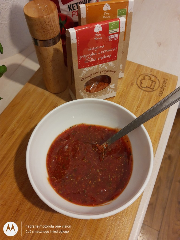 Do mniejszej miseczki wlewam zarówno ketchup, miód oraz wsypuję wszystkie ww. przyprawy.