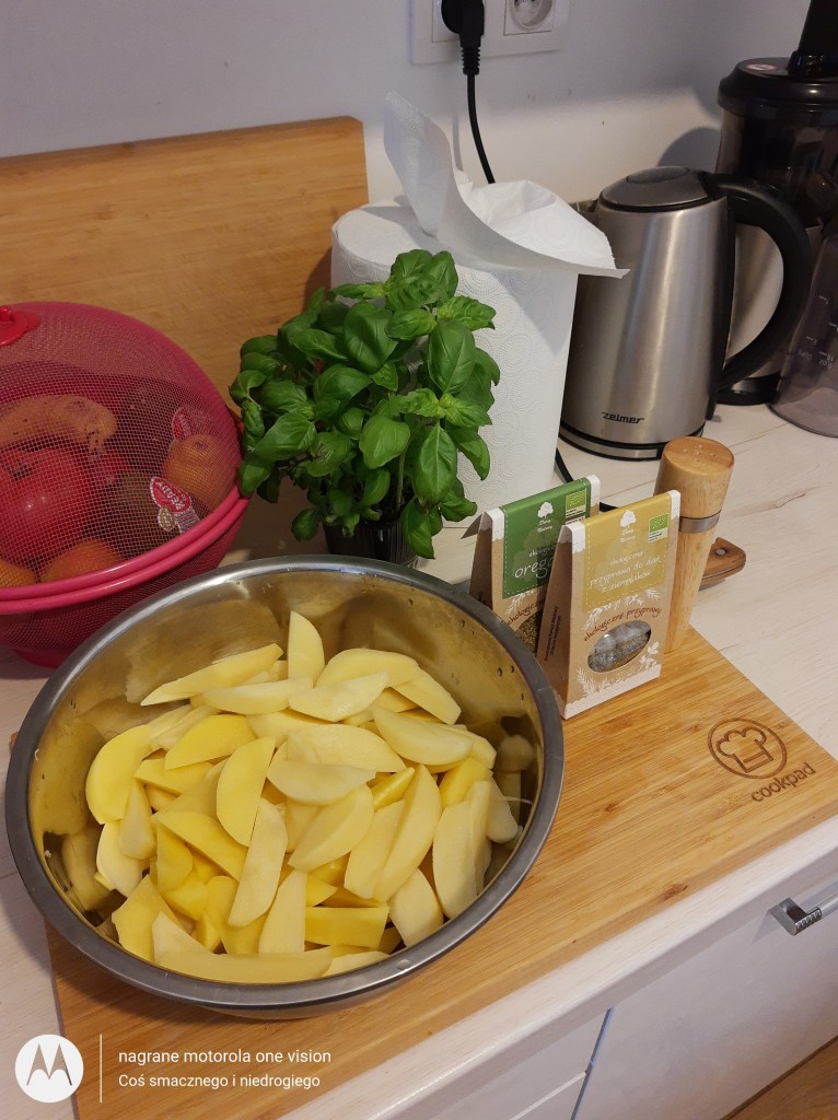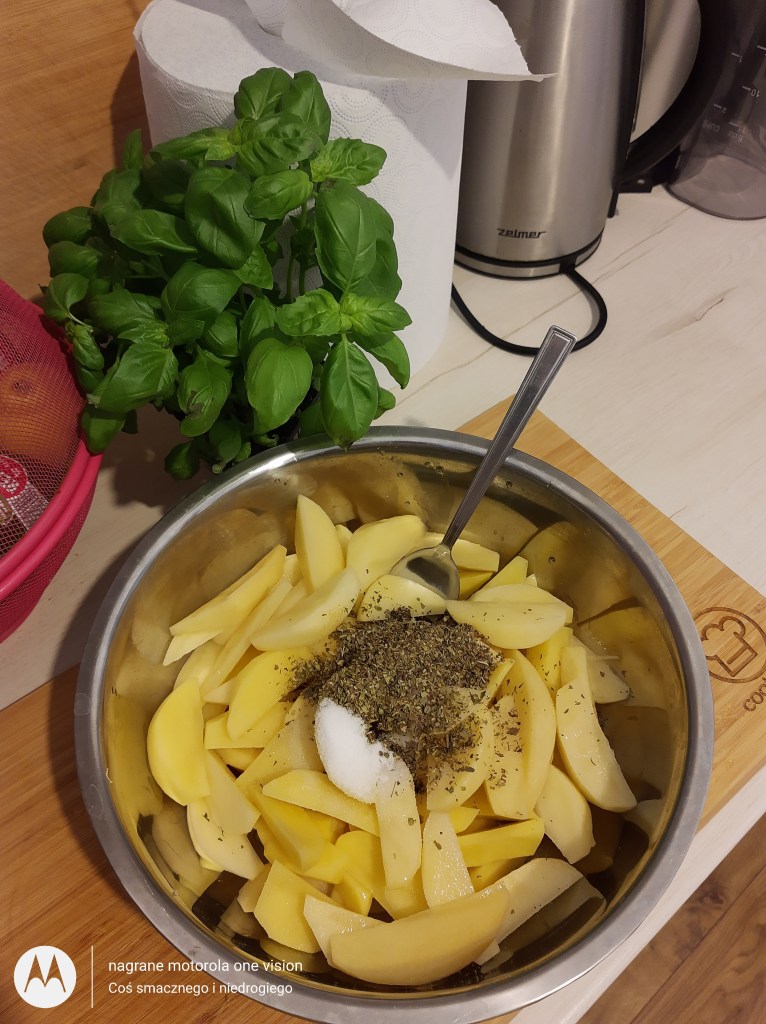 Aby nie próżnować ziemniaki obieram, myję, kroję w ćwiartki oraz starannie łączę z przyprawami i olejem.