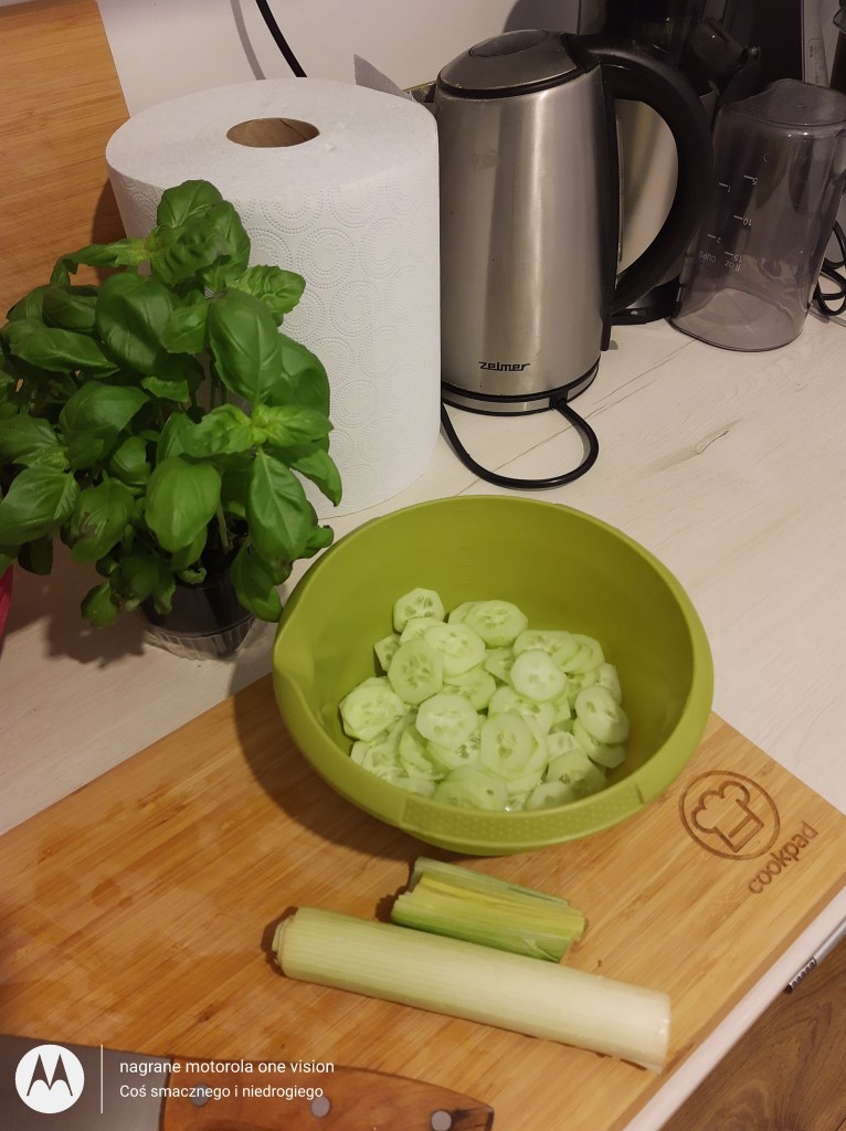 Ogórki obieram, także myję i kroję w plasterki, a por po umyciu drobno szatkuję.