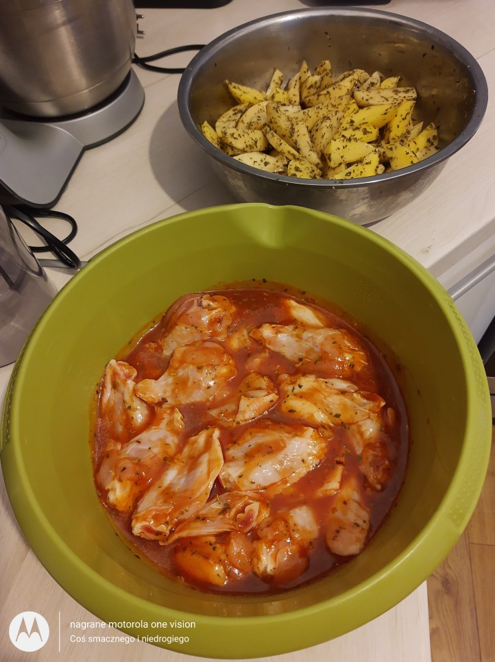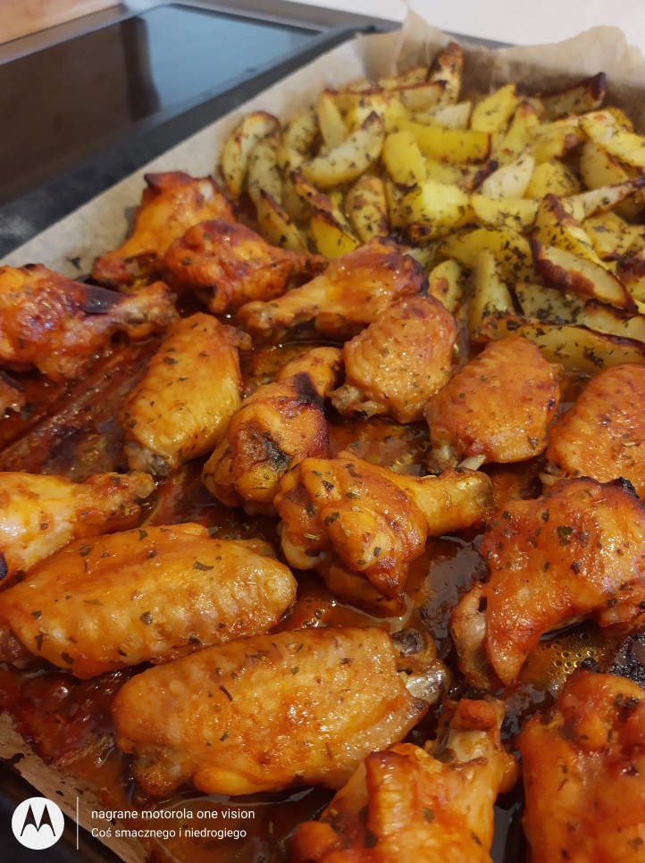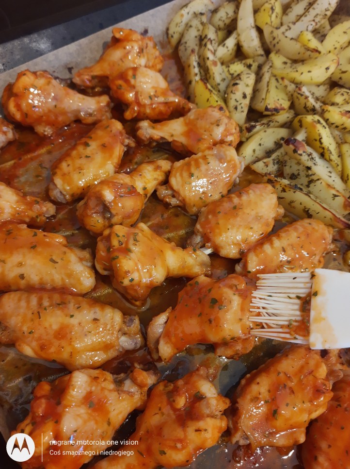 Po upływie ww. czasu na czarnej blaszce wyłożonej papierem do pieczenia skrzydełka polewam marynatą (część z niej pozostawiam do późniejszego wykorzystania) i wraz z ziemniakami wstawiam do nagrzanego piekarnika na około 180 stopni w termoobiegu i piekę wraz z ziemniakami 40 minut (po upływie 20 obracam skrzydełka i smaruję marynatą).