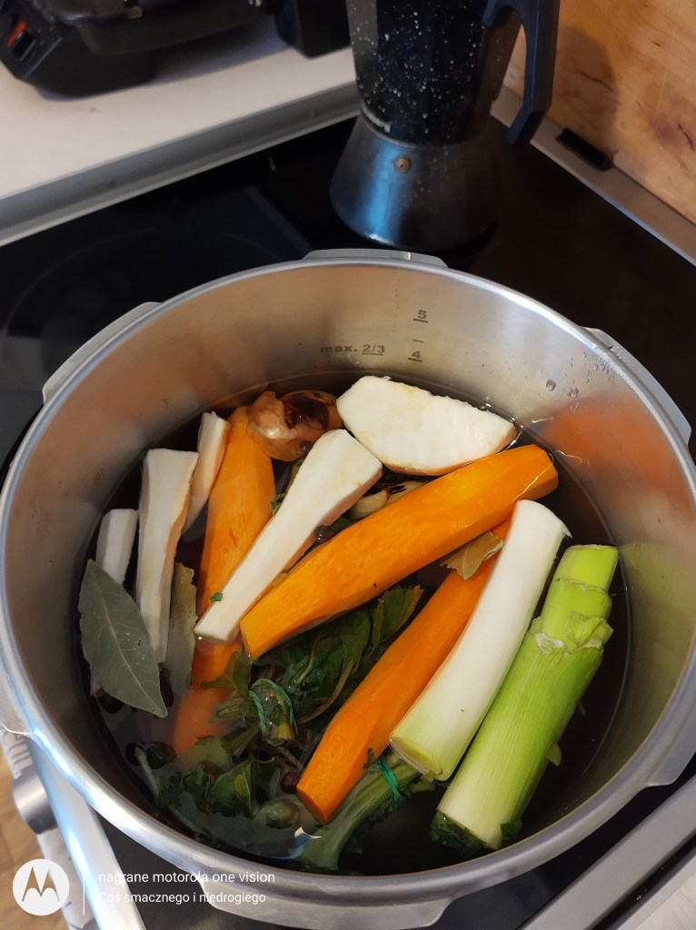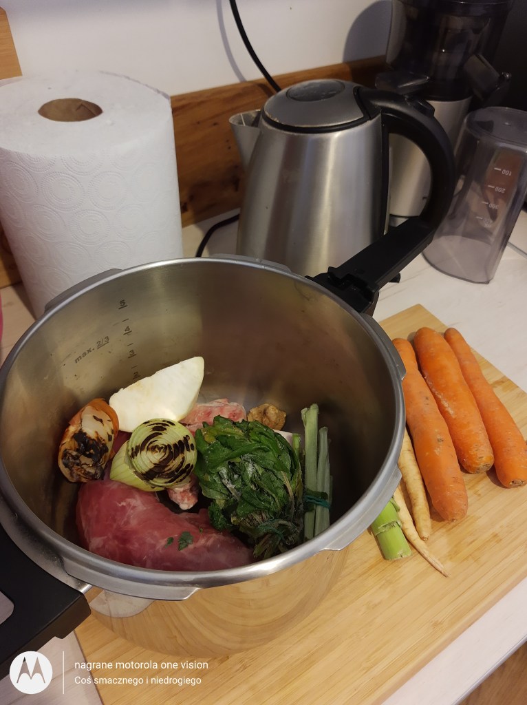 W szybkowarze umieszczam zarówno mięso jak i umyte, obrane warzywa (bez ziemniaków i szczawiu).