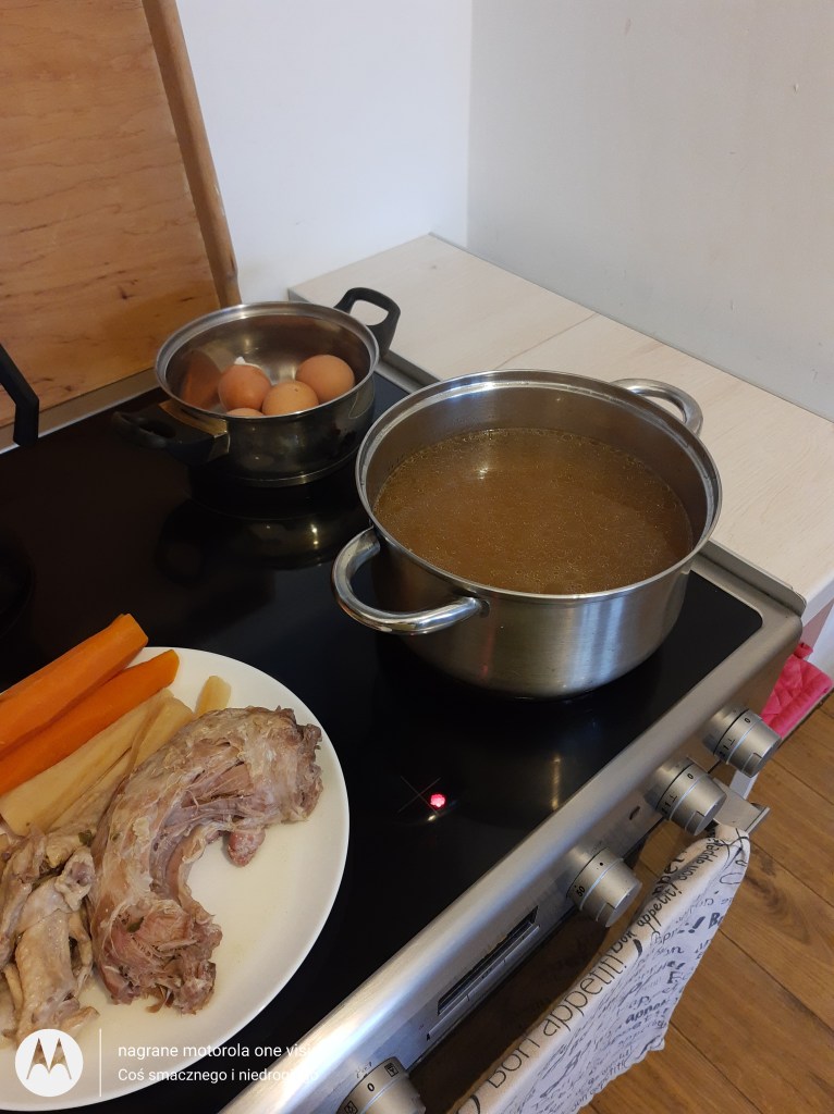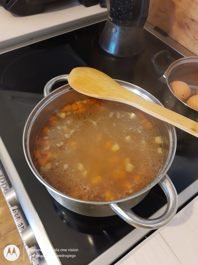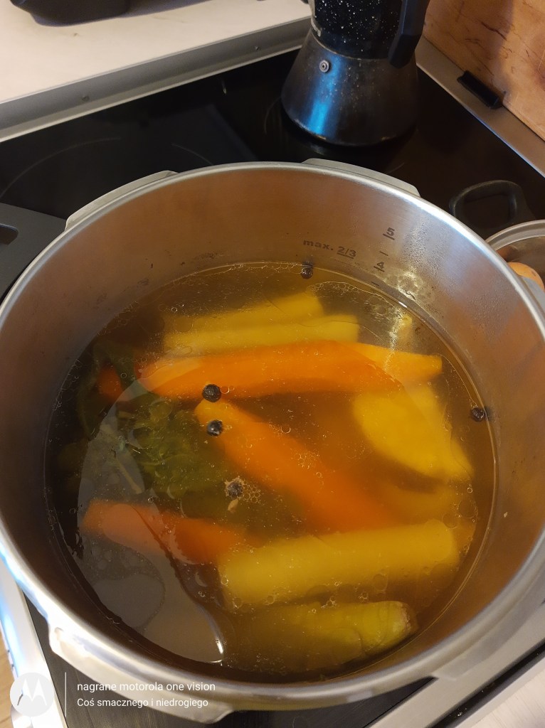 Potem otwieram szybkowar, odcedzam wywar i tym samym łączę z obranymi, pokrojonymi ziemniakami.