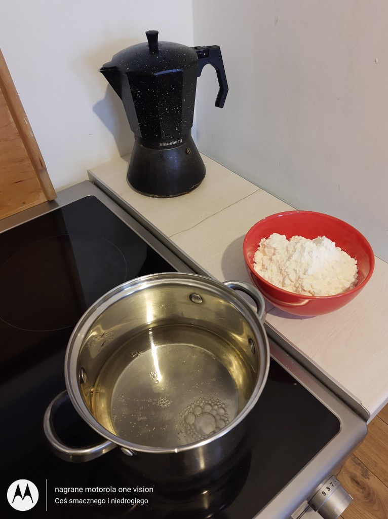 Wodę gotuję z olejem rzepakowym lub innym tłuszczem, a następnie nie przerywając ciągłego mieszania (najpierw trzepaczką, a później łyżką) wsypuję ww. mąkę i jeszcze chwilkę parzę ciasto aż odstawanie od ścianek garnka.