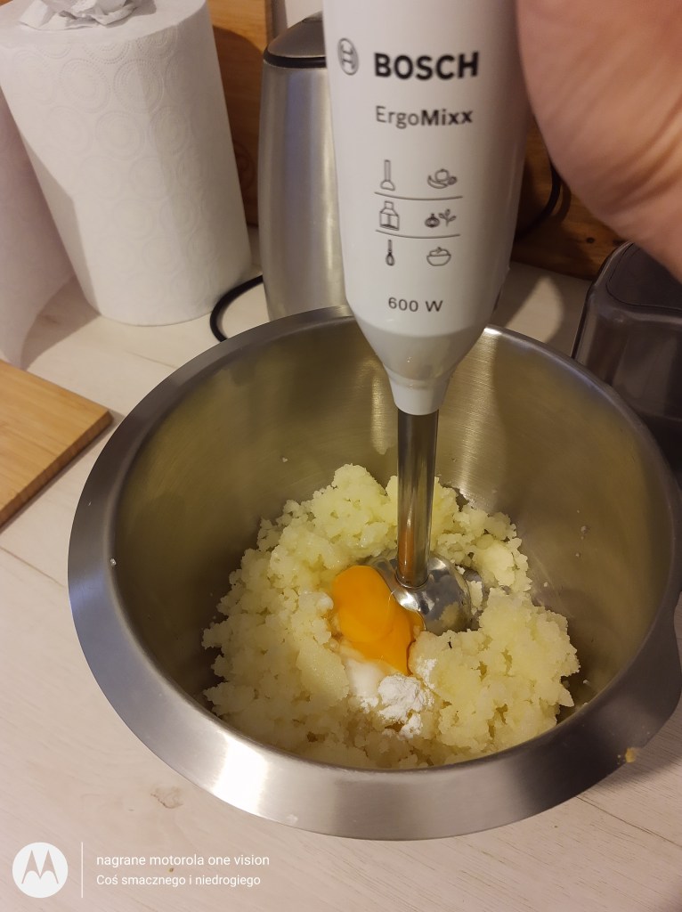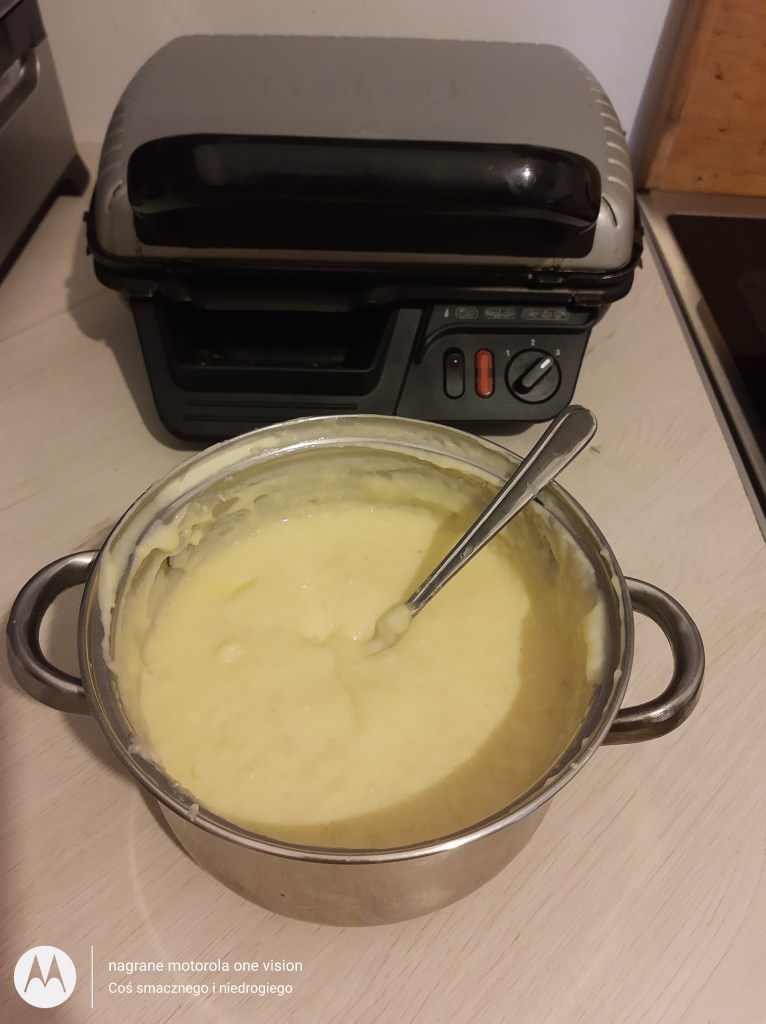 Tymczasem do pozostałej części mleka wbijam jaka i wsypuję mąkę ziemniaczaną oraz łączę z ww. masą, w związku z tym gotuję do momentu zgęstnienia.