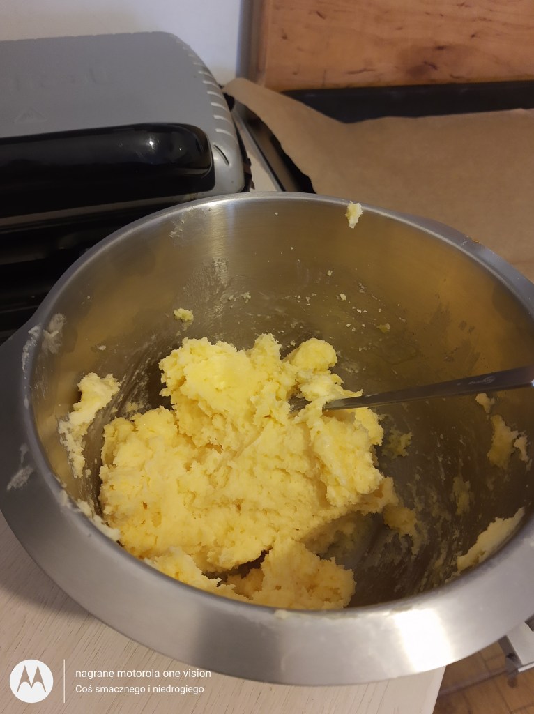 Tak przygotowane ciasto odstawiam do przestygnięcia i w związku z tym miksuję dodając po jajku na jednolitą masę.