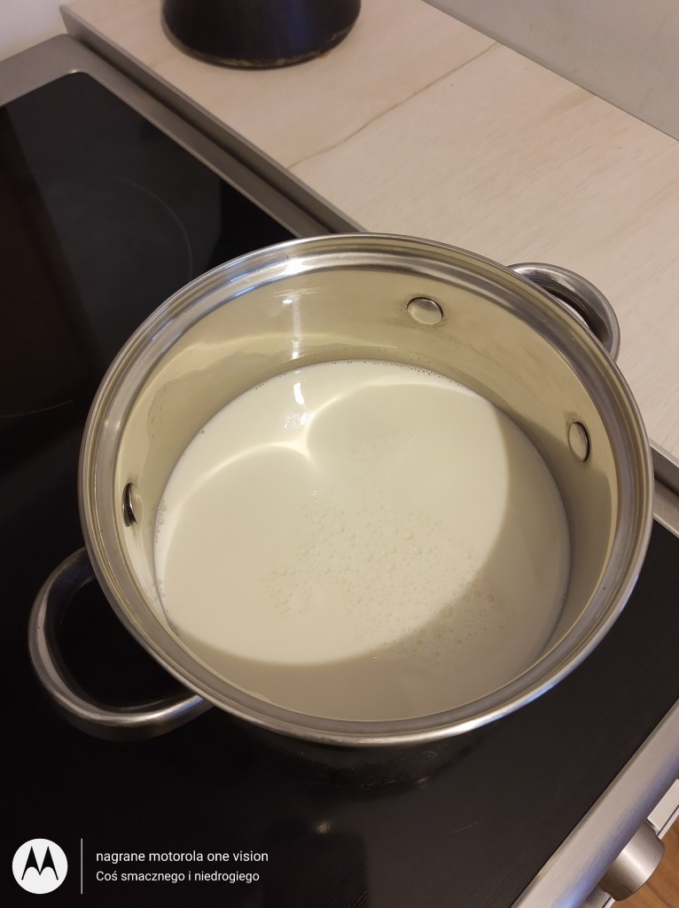 Do garnka wlewam odrobinę wody i zagotowuję, już zaraz potem dodaję 600 ml mleka wraz z cukrem.