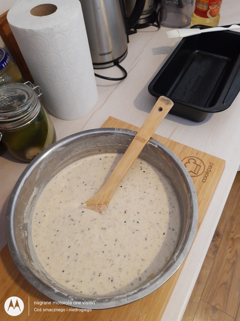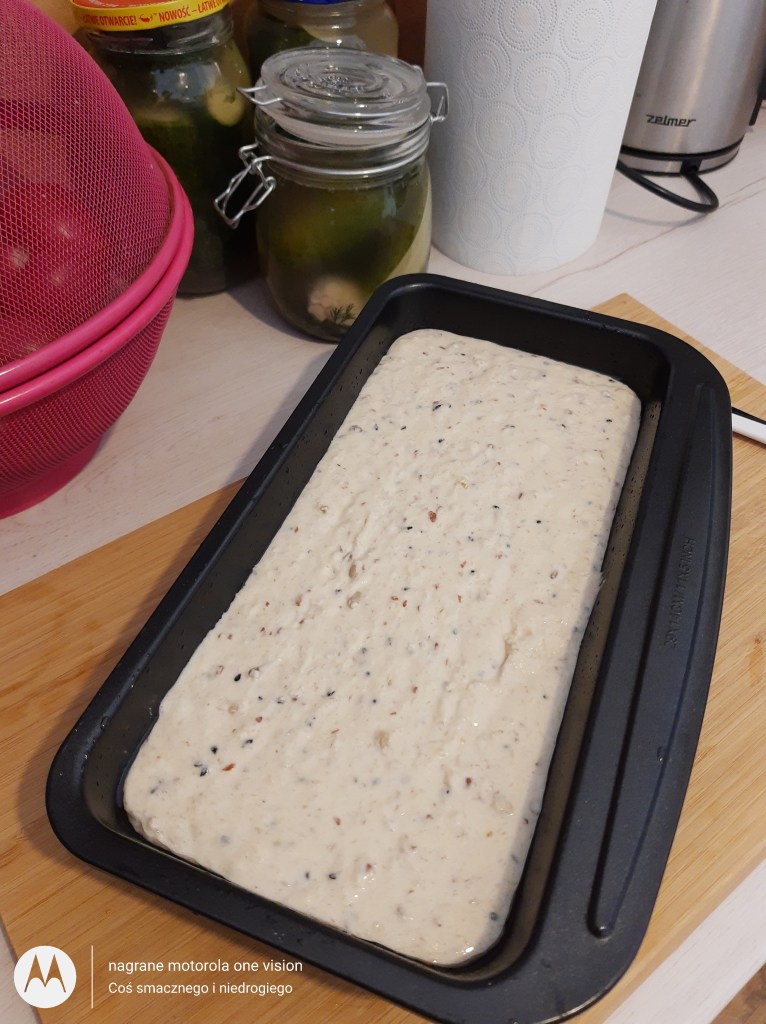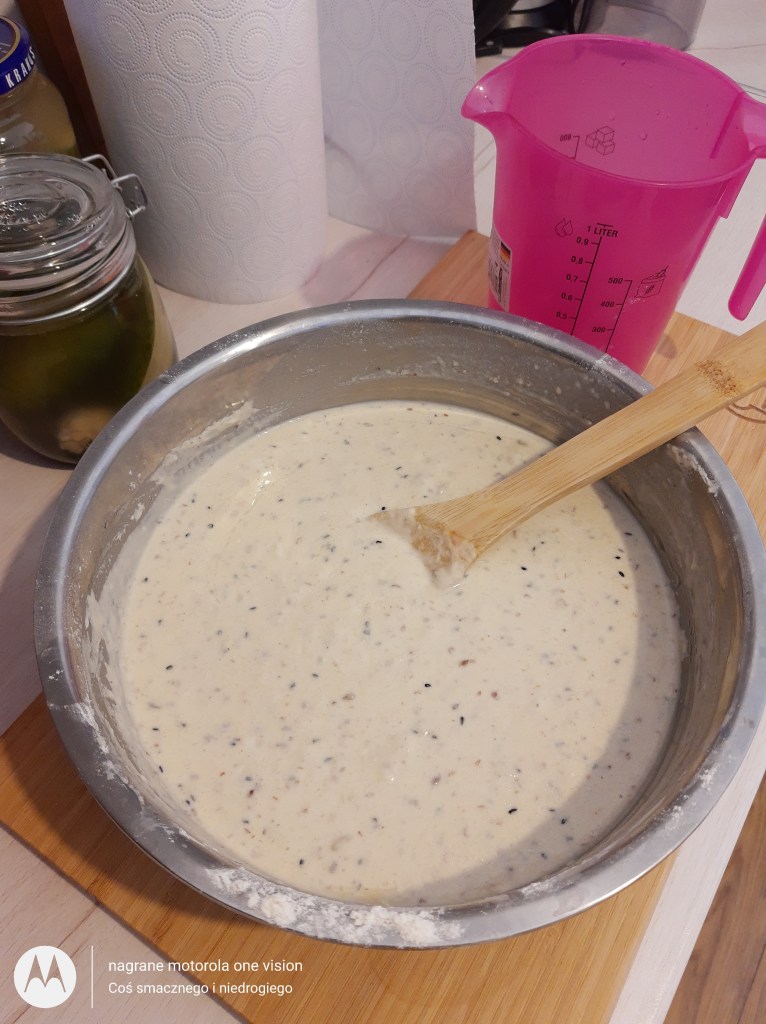 Ciasto na chleb wychodzi rzadsze, aby podrosło pozostawiam w ciepłym miejscu pod przykryciem przez okres około 30 minut.