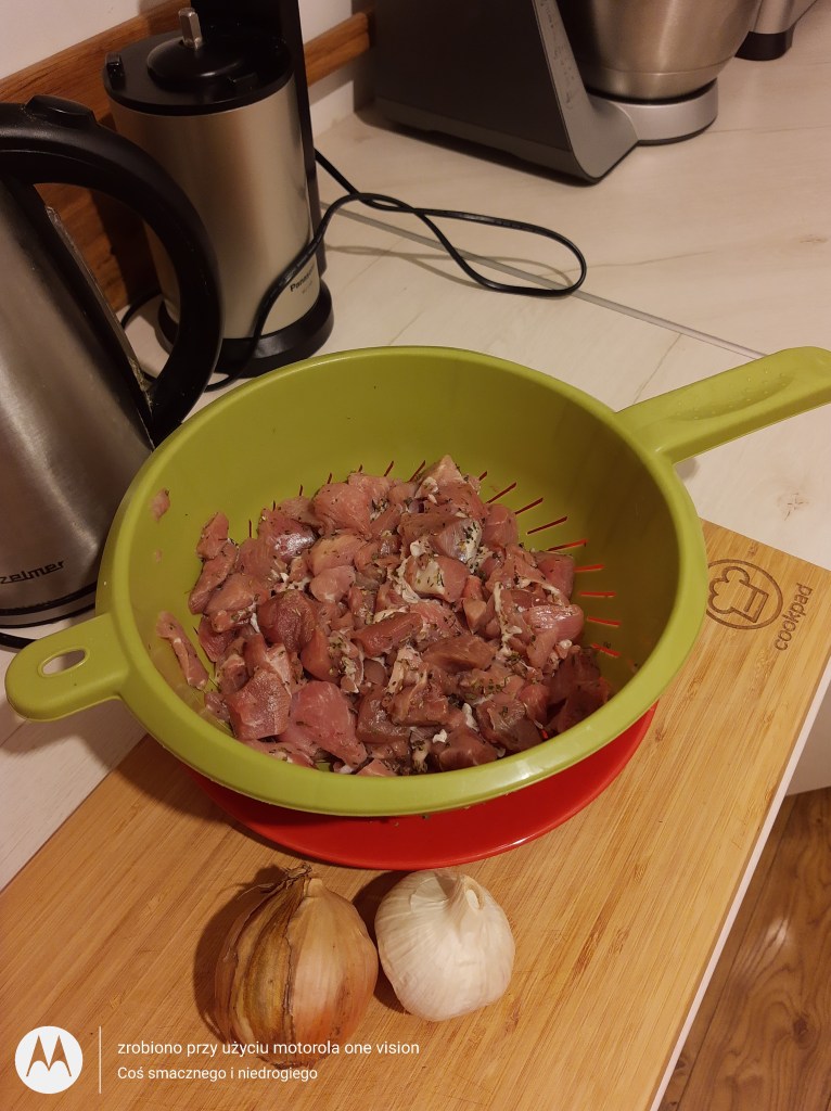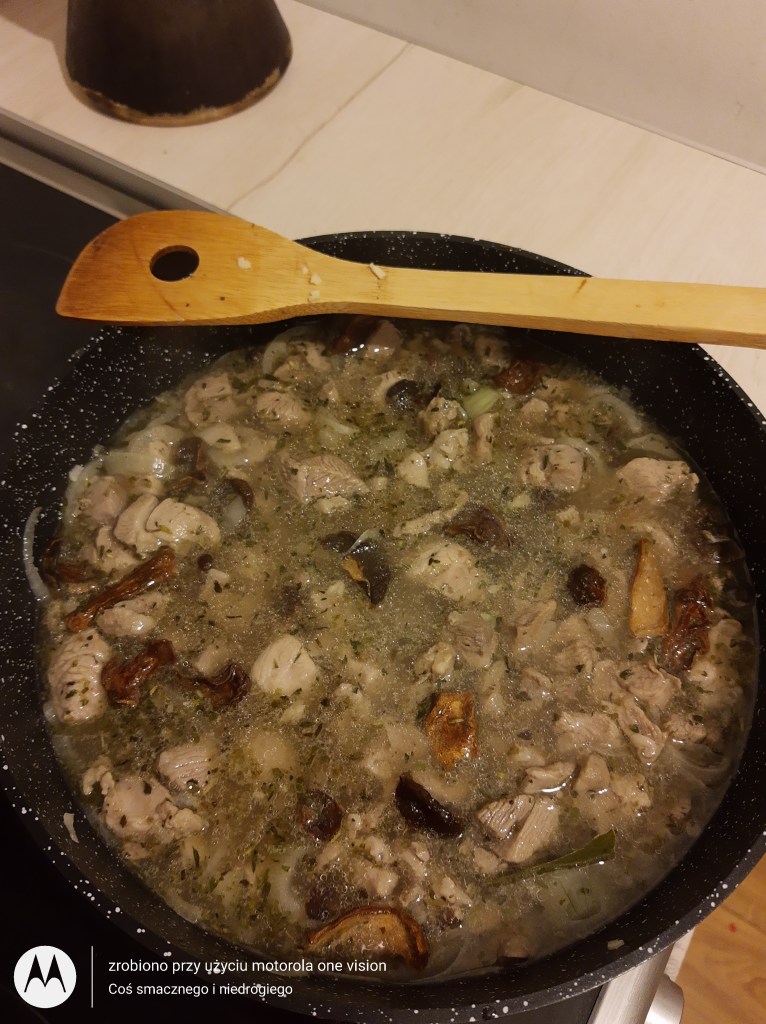 Następnie wlewam wodę (do poziomu przykrycia mięsa wraz z dodatkami) i dodaję suszonych grzybów, po czym wszystko duszę do miękkości.
